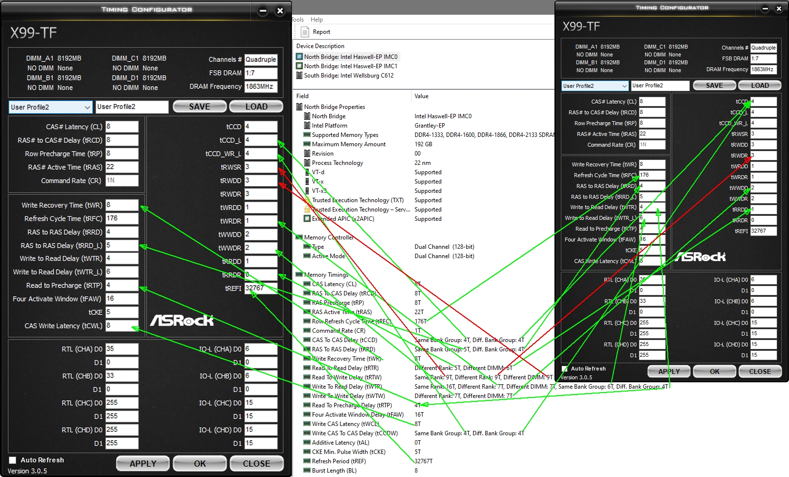 ну по большому счёту у тебя считай все 1.5, но если что, ту что 1.35 можно поперемещать по слотам если будут ошибки и поглядеть будет ли толк(обычно плохие планки поближе к процу ставят) а так православные YKO@2133 должны в этом духе выдавать: соотв всё что ниже, мутить как оптимизацию, когда у вас нет ошибок при условии 12-12-12-32 остальное в 0(т.е авто) 10-11-11-27-10-248-4-5-5-16-38-10 10-11-11-27-10-248-5-5-5-20-38-10 10-12-12-28-10-248-4-5-5-16-40-10 10-12-12-28-10-248-5-5-5-20-40-10 11-12-12-29-12-248-4-6-6-16-41-10 11-12-12-29-12-248-5-6-6-20-41-10 для@1866 9-10-10-26-10-248-4-5-5-16-36-8(или 9 смотреть по СPUPhotoWorxx, что больше) 10-10-10-26-10-248-4-5-5-16-36-10 либо теже варианты от @2133 trfc=248↑, потом(cамым последним) понижать через Асрок по 8, до возможностей своих чипов = пока не зависните потом к полученному прибавить 24 или 40(для верного) и внести в биос. у trfc от плотности чипов памяти зависимость - для примера K4B2G0446D =>2G и будет@2133=+-120, а 4G =+-240 и растёт с поднятием частоты памяти и наоборот. картинка↓ для понимания последовательности