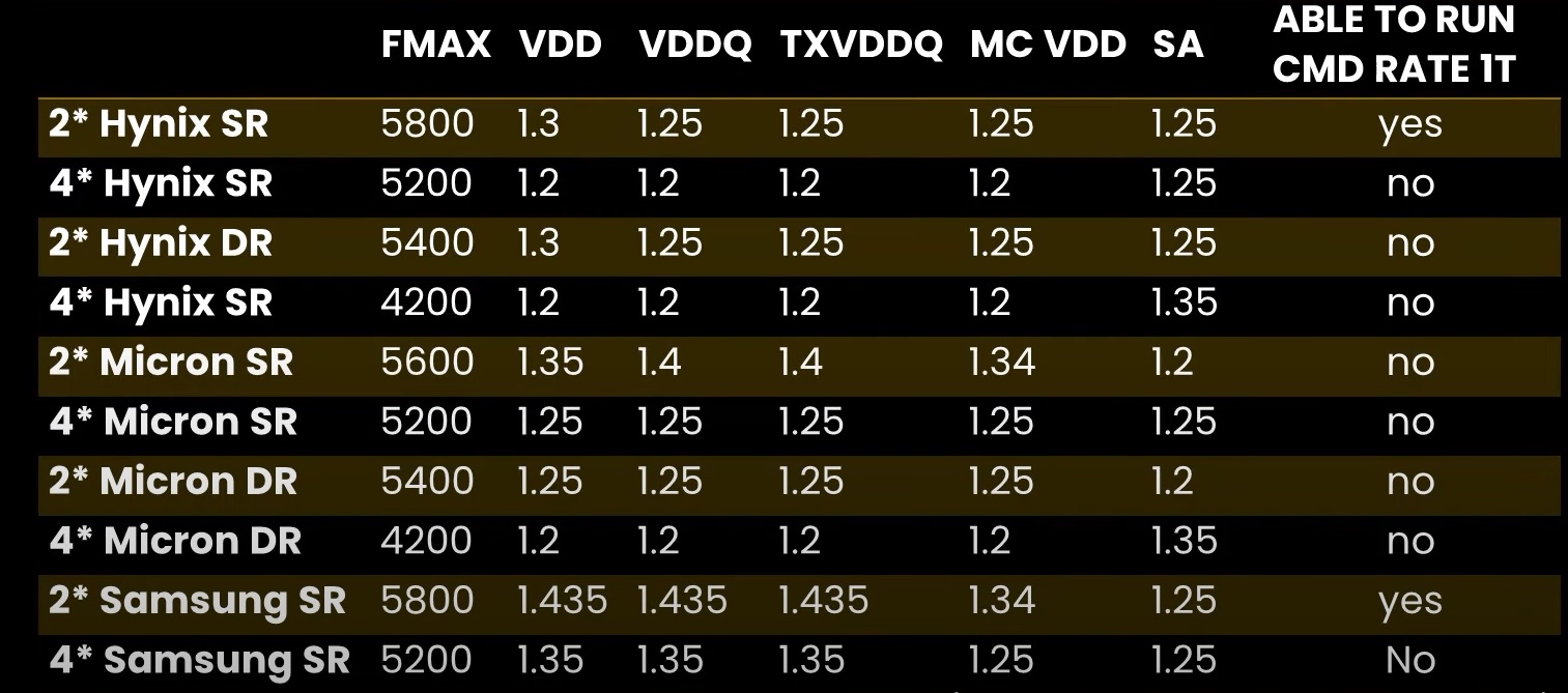 SR modules typically can scale with VDD>1.3v while VDDQ may not need much over 1.25v. So you may end up running something like 1.35v VDDQ + 1.25v VDDQ. (inverse from what you see on micron) Similar for DR modules. 1.25v MC VDD works well for them. 1T command rate works with these.