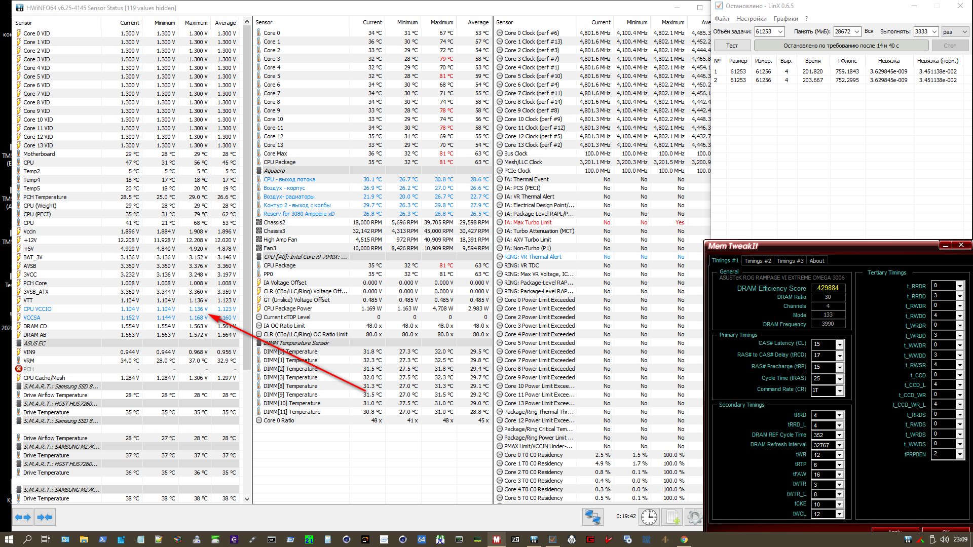 не знаю зачем народ завышает VCCSA, VCCIO когда его наоборот надо занижать))) главное в нагрузке разницу между этими напругами держать 32(лучше) -36(хуже) mv. да под 5.2 гг у меня уже требует чутка больше но это совсем чутка где то 1.134-36 1.168. никакой стабильности и масштабируемости овер стена она не дает. и да, на тех что сейчас заниженных даже меньше ошибок на специально заниженных таймингах при 14cl ошибок даже меньше становится. Очнитесь, нас хотят поджарить (фото с блока N1 где только проц)