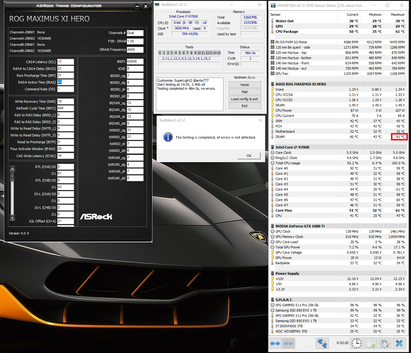 В биосе выставлено IO=1.23125, SA=1.30000, но по мониторингу выше. Насчёт IO не знаю, но SA меньше нельзя, иначе ошибка в 11 тесте в каждом цикле. Температура поднялась до 61 °С.