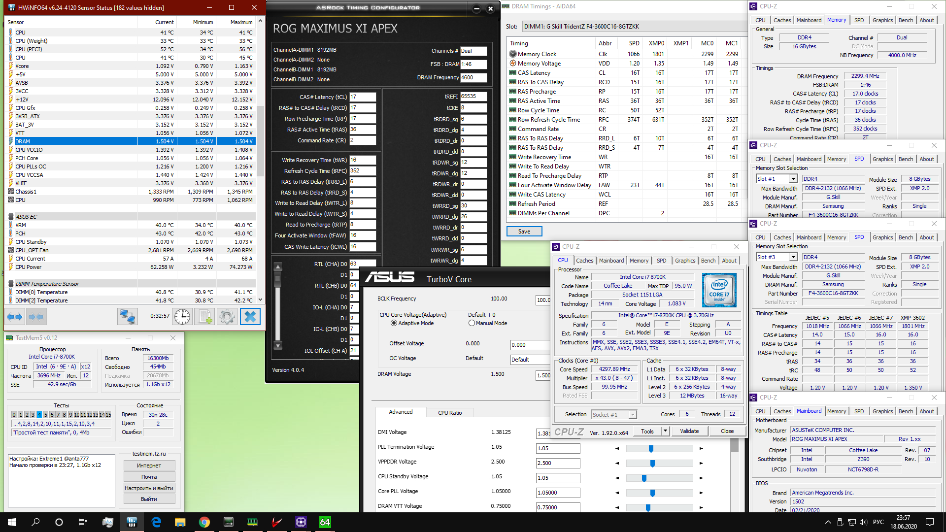Господа, что можно добиться от 8-ми слоек F4-3200c14d-16GTZ (первые ревизии) По формуле и тренингу мне удалось только 4133 18 18 18 40/38 (1.37v), если чуть добавить, уже хотят 1.45, и не меньше 1.35 на все остальное..., это предел или есть еще какие-то фокусы? Мать Asus z390i+ 8700k`4800Ghz И еще вопрос, почему на этой матери обе планки в A chanel?