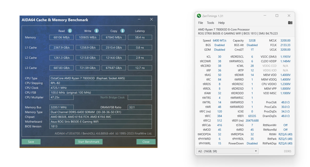 Имеем: 7950X, и память 4x48Gb (комплект 2x 2x48, если интересно то имеем 4 модуля с сериймными номерами идущими подряд - это ничего не значит, но просто интересное наблюдение, всё же это 2 комплекта по 2), G.Skill F5-6400J3239F48G. Напомню, что память не хотела устойчиво работать на 6000, и так это и осталось.