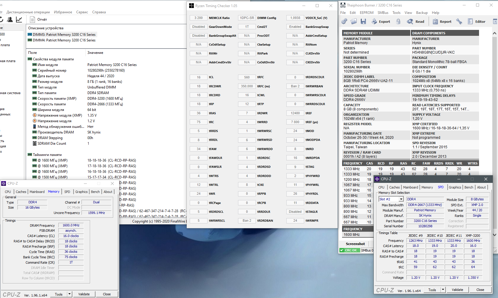 Добрый день, отличная тема, много всего познал на пути к разгону . Имеется: Patriot Viper 4 Blackout Series 16 ГБ [PE000666-PVB416G320C6K] две планки по 8гб 3200мгц в хмп ASRock B450M Pro4-F https://www.asrock.com/mb/AMD/B450M%20Pro4-F/index.ru.asp c последним биосом 2.80 Ryzen 3400G он же и видеокарта(главная цель разгона RAM) Для начала хотелось бы помощи в определении чипов, так как они затёрты. Вот что говорит софтовая часть, но насколько я понял тайфуну на 100% верить нельзя, да и в графе die density подтёрто тоже: