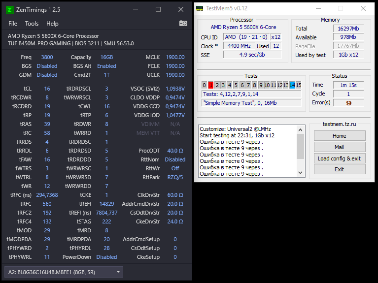 При указанных вами таймингах я даже универсальный пресет пройти не могу, хотя подкинул 1.4V на память, 1.1 на SOC, снизил частоту до 3800 и поднял частоту ЦП до 1.2V.