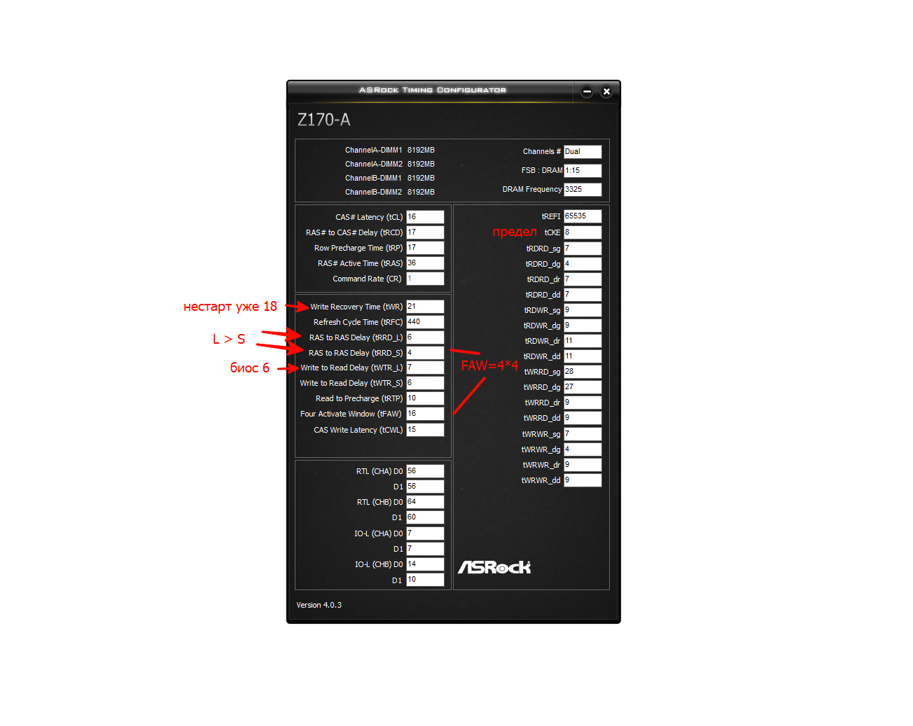 tRASmin=tCL+tRCD+2 WTRS/L устанавливаются в биосе через WRRDdg/sg согласно формуле: WRRD_sg=6+CWL+WTR_L WRRD_dg=6+CWL+WTR_S WR - через WRPRE (для матплат ASUS): WRPRE=4+CWL+WR RTP - через RDPRE (для матплат ASUS) RDPRE=RTP