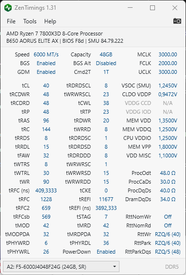 6200 заводил на CL28. в играх вроде ок, но с ошибками можно конечно и 30, но ощущение, что профита не много будет кто-то заводил 6400 2х32? просто EXPO 6400, но CL32-39-39-80. может и можно, но тайминги так себе. в целом это наверное все равно лучше будет, чем мои 6000. по сути же больше всего tREFI и tRFC влияют на скорости и задержку у меня сейчас так, вроде улучшить особо нечего. единички на SD и DD по-моему не запускают систему, да и не влияют вроде, как я понял только напряжения не верные, VDD 1.37, VDDQ 1.33. меньше не пробовал ужимать