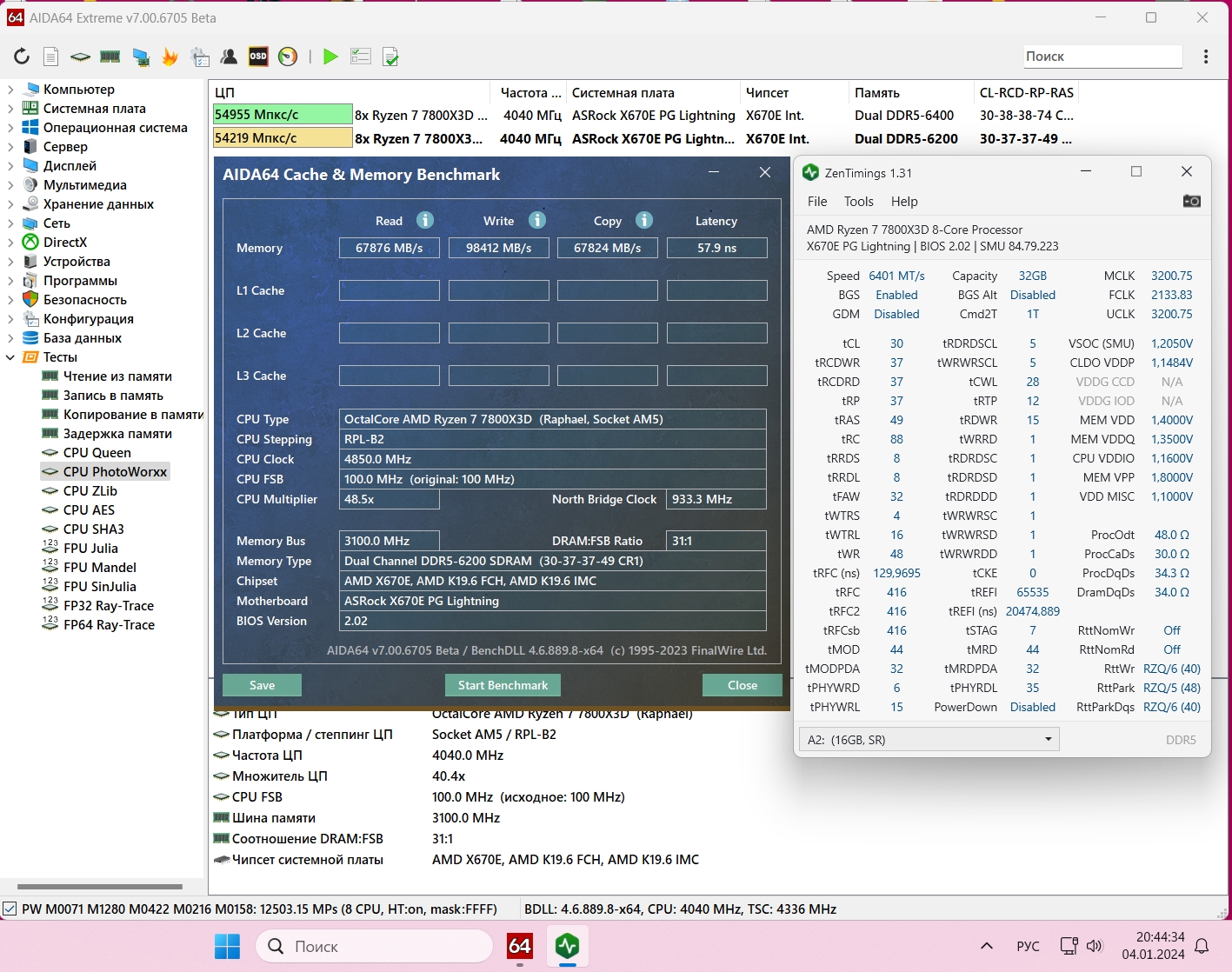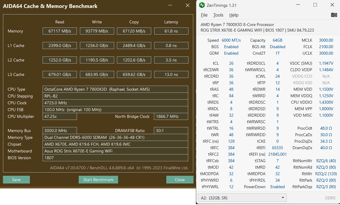 У меня почти такая же связка (7800X3D + KingBank 6400 Mhz только 2х32), тоже плата Asus, только X670E-E Gaming Wi-fi и я не понимаю прикола, почему у асуса в биосе все параметры разгона дублируются во вкладке Advanced. При изменении в AI Tweaker в Advanced ничего не меняется + там тайминги ОЗУ вообще в HEX-значениях - извращение какое-то Я вот пробовал на 6400 завести, правда мне было лень задирать снова tRFC и прочие, что могли влиять на стабильность. ее не было и откатился обратно на 6000. 6200 с таймингами от 6000 было почти ок, но не поехало. недавно установил обдув на ОЗУ (накладка из 2 60мм кулеров), так что думаю можно возвращаться к тестам 6400) а так в целом я понял, что по сути производитель и наличие XMP/EXPO у плашек не имеет никакой роли. можно взять условно самые бич-планки на A-die и они будут работать абсолютно также, как и дичайше дорогие планки с профилями 7800-8000 на этих же чипах. разница только в качестве радиаторов и наличии определенного дизайна или подсветки (для тех, кому она нужна)