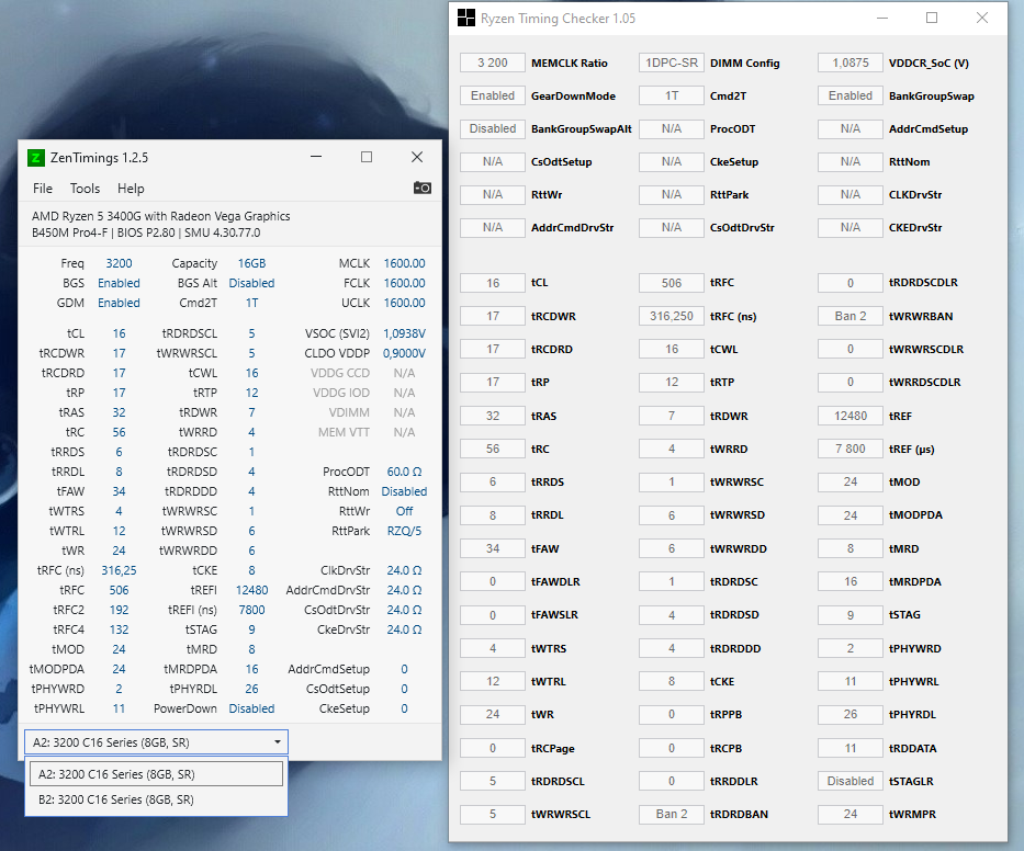 ASRock B450M Pro4-F / Patriot Viper 4 Blackout Series 8+8гб PVB416G320C6K / Ryzen5 3400g (zen+) Проц+встройку не разгонял, весь биос на дефолте, биос офк последняя прошивка. Видеокарта встройка, так что подстройка озу ещё более капризная нежели с внешкой. С чего начал, нашёл минимальные первые тайминги на родной 3200мгц,всё остальное авто, разве что скинул немного tRFC c 560 до 506, пересчитал в наносекунды: