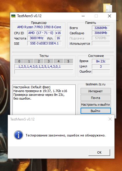 7. При желании протестировать память избыточным тестом в TM5 с конфигом 1usmus_v3 меняем количество 3-х циклов в "mt.cfg", "cycles=3" скажем на 8 или более