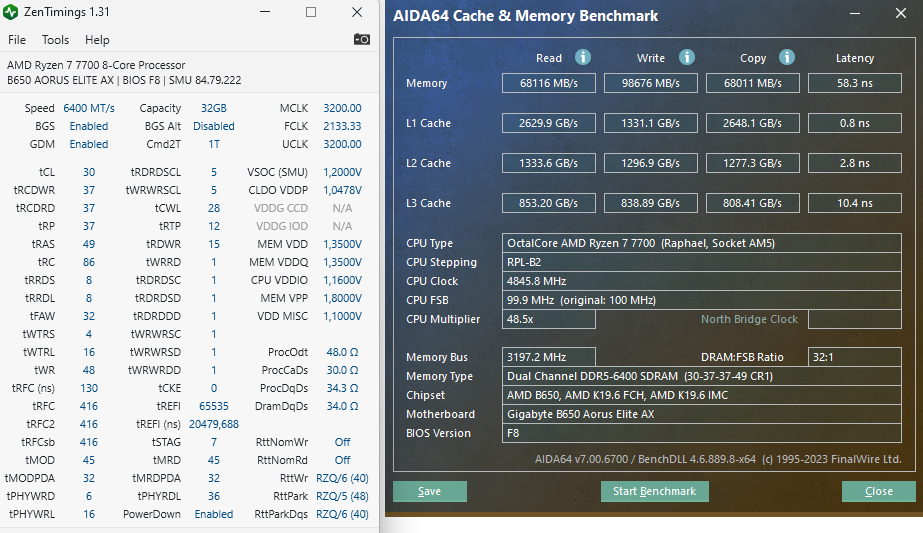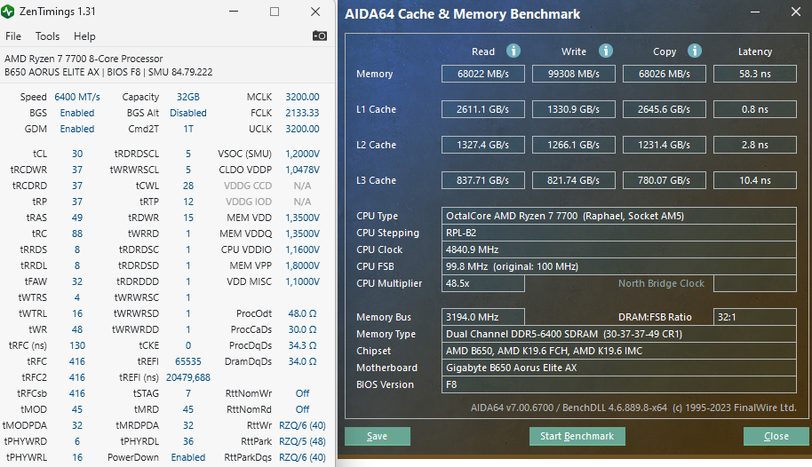 Напряжение для DDR5-6400 снизил VCore Soc до 1.200 (было 1.205) и MEM VDD до 1.35 и скорость неожиданно возросла, температура уменьшилась до 54 гр., ошибок после 15 минутного теста без ошибок в tm5, testmempro и y-cruncher