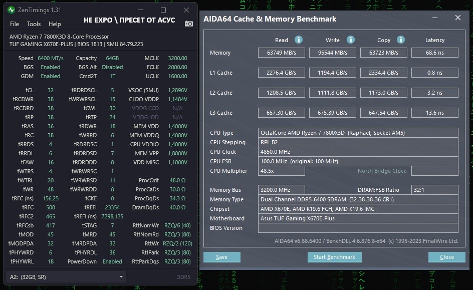 мне бы твои проблемы. у меня на такой же плате (E-E), 7800X3D с 2х32 вообще отказывается на 6400 заводиться даже с вшитым в плату профилем (таким же раздутым, как XMP). может догрузиться до винды и даже начать аиду проходить и откиснуть 6200 только завел и все. может нужно VDDP и MISC поднимать? потом сделаю скрин таймингов 6400, с которыми не заводится. если смогу загрузиться в систему
