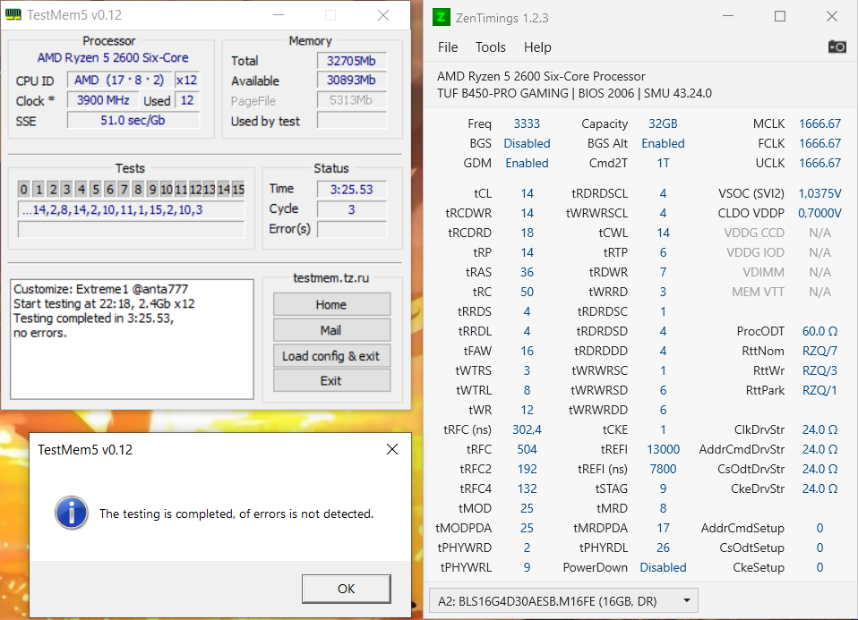 Толи лыжи не едут. При практически любых частотах выше 3600 (ниже не пробовал, ибо это XMP для памяти) TM5 рано или поздно выдает ошибки. Пробовал и с выставленными вручную основными таймингами, и со всем на автомате. Напряжение повышал до 1.45В, понижал до 1.37В (c низкими частотами). Пробовал снижать FCLK. Результат один. Может вплоть до 2х раз подряд пройти тест (6 циклов, примерно 37-38 минут), а потом выдать ошибку спустя 3 минуты. На Интеле эта память стабильно работала на 4133 17-19 1.41В Нагрев исключен, память обдувается и холодная. Еще из странностей материнка не мониторит напряжение памяти, ни в биосе его нет, ни в мониторинговых программах. На АМД память загружается вплоть до 4333, но со стабильностью беда. Может матплата что-то неправильно автоматом ставит? Ниже скриншоты различных тестов и настроек