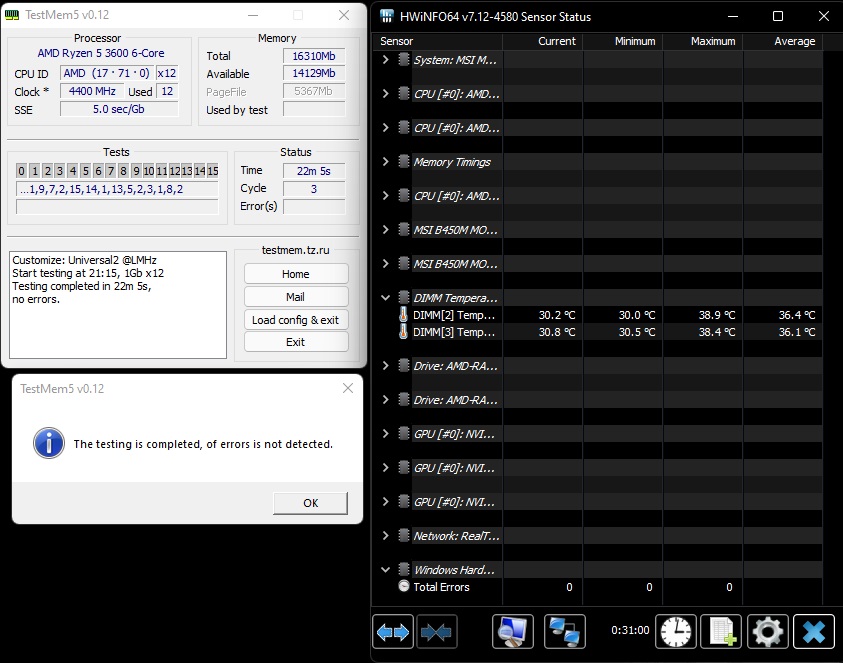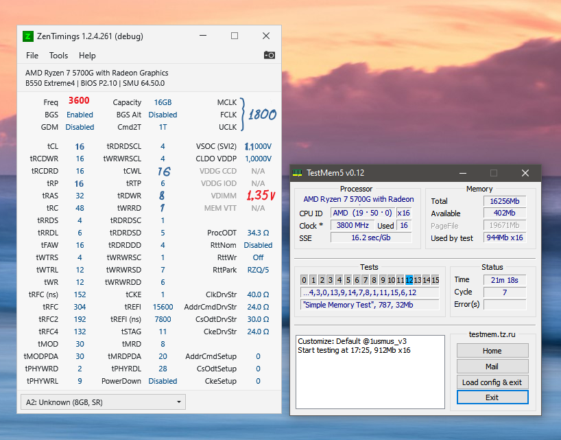 Еще раз проблема не в том что я не могу подобрать тайминги для 3600, 3800, 4200, а в ошибках в TM5 зачастую независимо от частот. И чем больше я с эти вожусь тем больше кажется мне что дело не в памяти. Сегодня, например, я снова осмотрел и протер контакты, загрузил optimized defaults и выбрал XMP (раз уж память есть в QVL, то почему бы и нет?). Система отработала более двух часов в TM5 usmus3 (20 циклов), потом более 5 часов в TM5 universal2 и только тогда выдала первую ошибку. При последующем запуске TM5 usmus3 ошибки начались уже спустя 10 минут. Вытащил одну планку, запустил usmus3 снова ошибки почти сразу. Т.е. в какой-то момент стабильность посыпалась. Завтра проверю другую планку, потом другой слот. Потом, если проблема так и не будет найдена, дело будет за другими матплатой и процессором... То что было простой сборкой для родственников с использованием части своих старых комплектующих превратилось в большую мороку. Хорошо хоть этот комп на работе, хоть дома на него не отвлекаюсь.