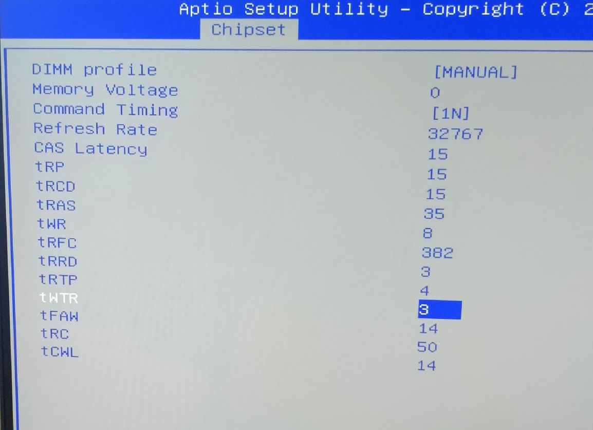 Ну так вроде и не ай7 у меня, и за пределы частот не выхожу? POR выключен, PPR выключен. Всевозможные Propagate warnings тоже дергал туда-сюда, даже в настройки трейнинга залез. Разницы 0. Кстати, если не выключить MEMTest, плата грузит минут 10 (но грузит). Мои подозрения все-таки на то что LRDIMM Module Delay в SPD кривой, в настройках вручную его не поставить, можно только совсем выключить, тогда 55 и писки "Нет памяти".