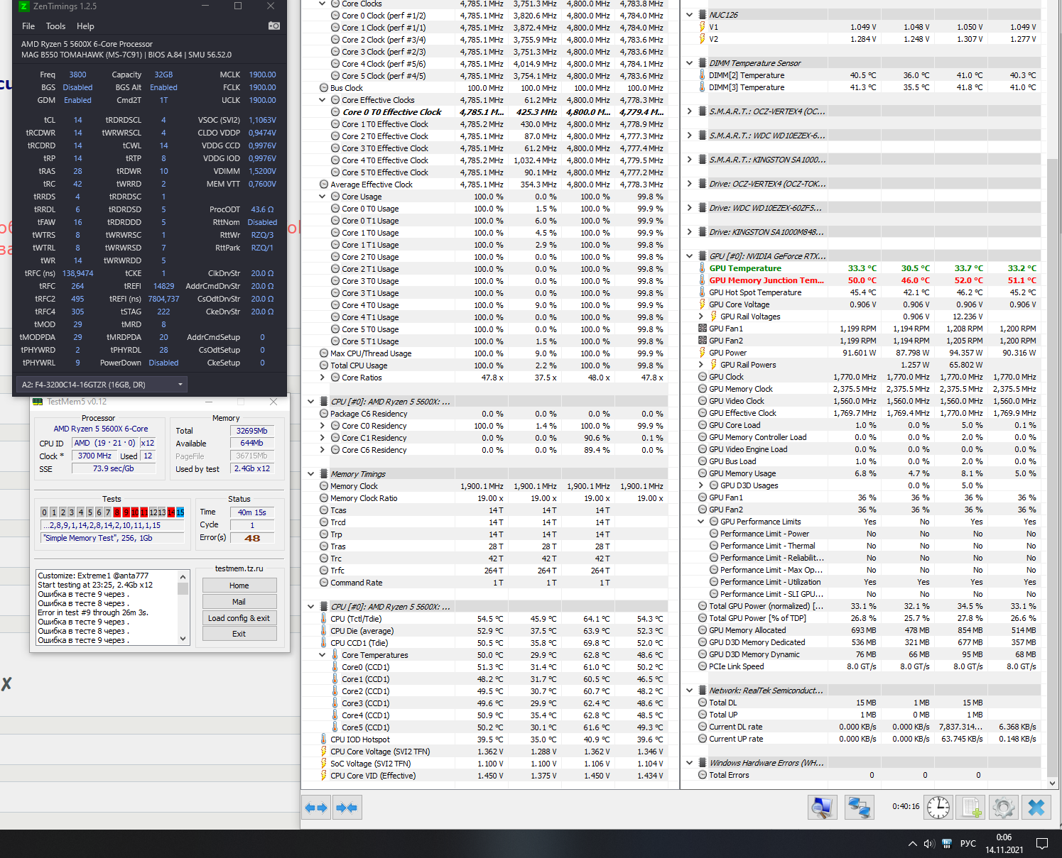 Спецы, помогите разобраться. На борту 128 Гб: 4 плашки Crucial Ballistix 64 ГБ (32 ГБ x 2) 3200 МГц CL16 (BL2K32G32C16U4B). На памяти 1,4 V, на Soc 1,1 V (LLC 2). Винда грузится и в работе все вроде стабильно, но тест extreme@anta777 за 8-10 часов все же выдает парочку ошибок. Как отловить? Пробовал выставить только первичные тайминги, а остальные в Auto, но тогда еще хуже, даже короткий тест сыпет ошибками в первые же минуты. Пока удалось выявить только такую закономерность: на прохождение тестов сильно влияет tRP, при 16 множество ошибок в начале теста, при этом не важно как выставлены вторичные тайминги. Ставлю в 17, все отлично, не считая ошибки, описанной в начале.