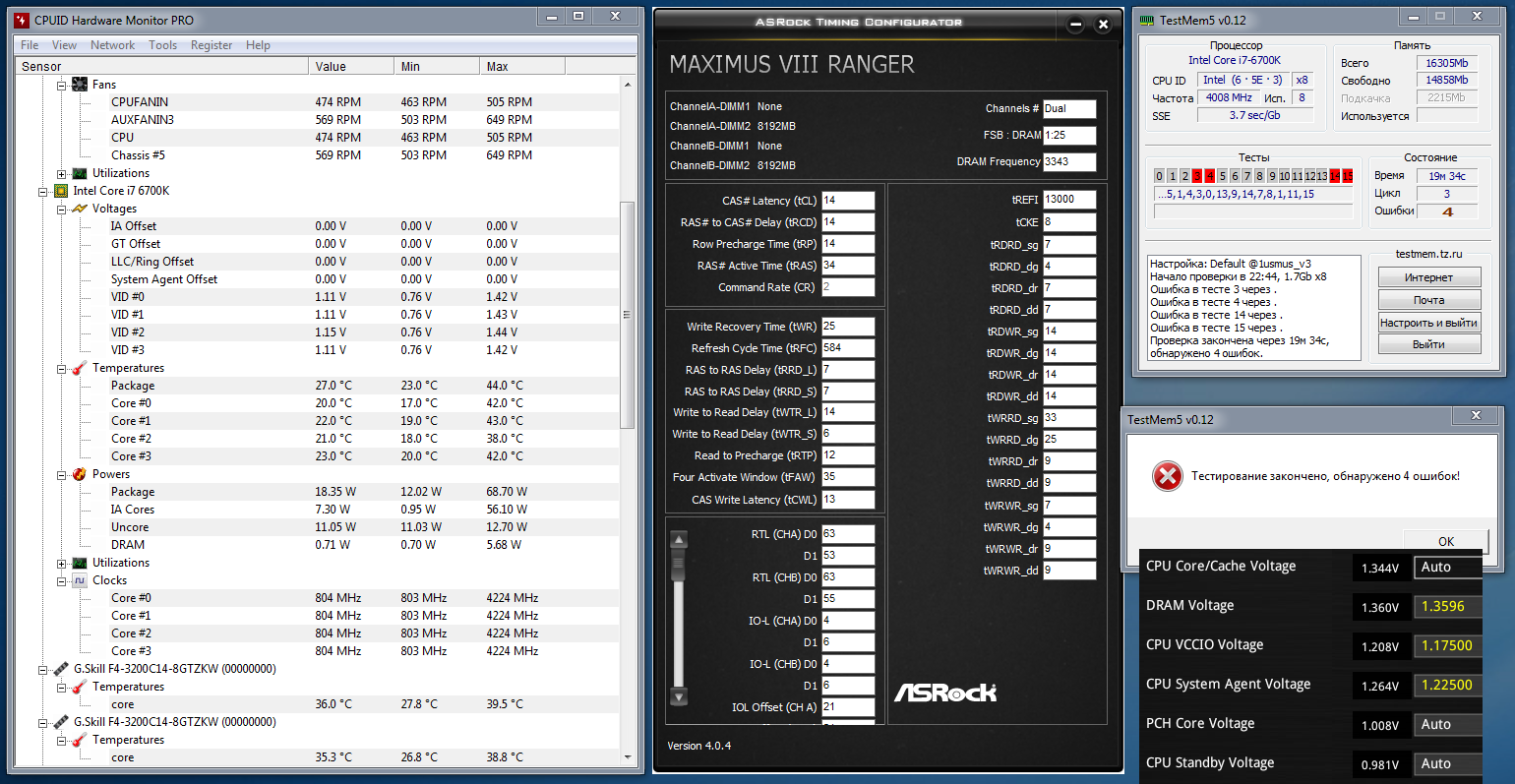 А вот дальше вообще туго: 3333MHz запускается через раз, система то запустится, то выдаст ошибку 55. Если запустится, то может пройти ТМ5 без ошибок, а может и с несколькими ошибками: