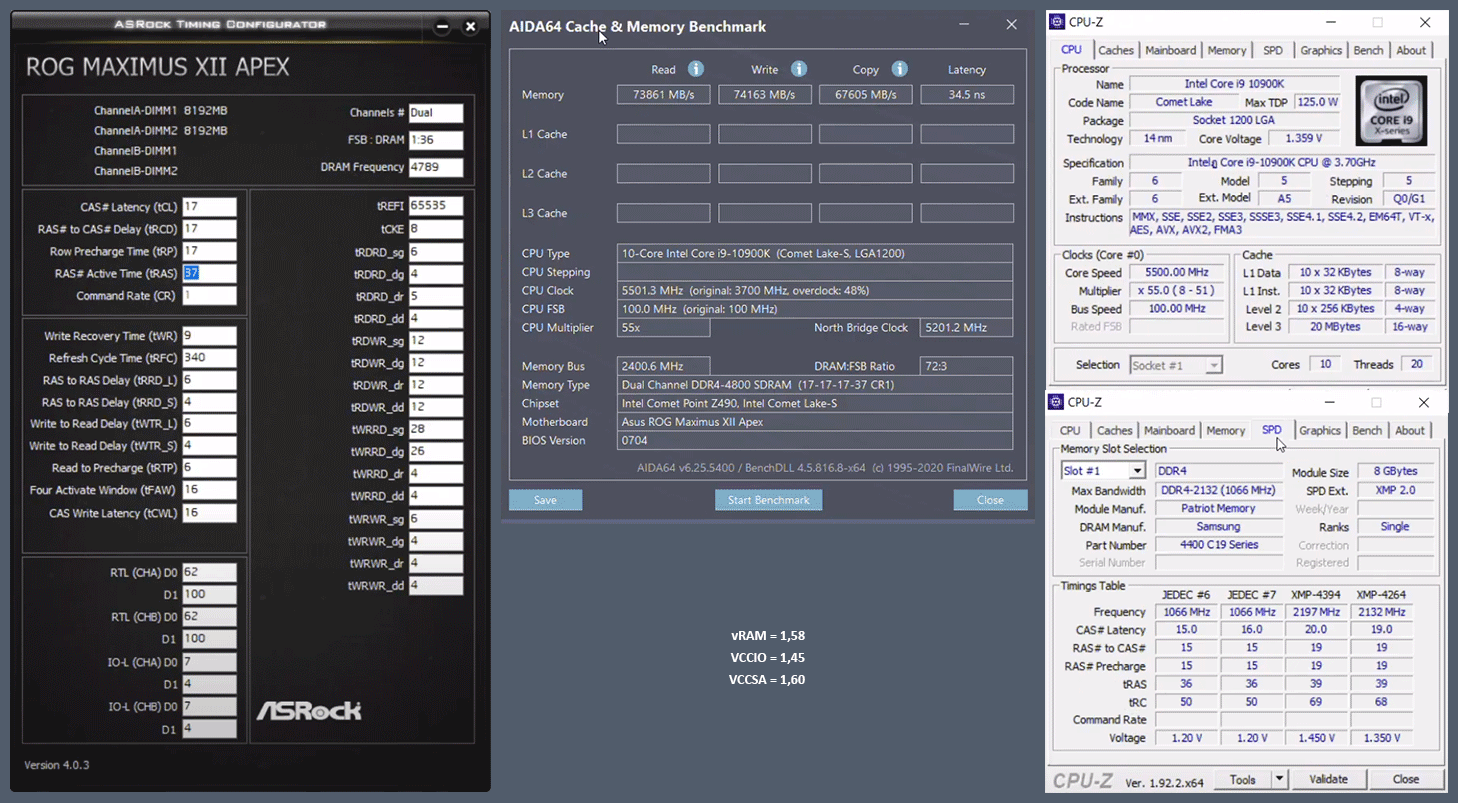 Кто-нибудь сталкивался с проблемой, когда TM5 (конфиг от anta exterme, 6 циклов) проходит без ошибок, а memtest и Karhu RAM Test сразу выплёвывают ошибки? Причиной тому мне пока удалось выявить слишком высокое напряжение VDIMM в 1.372 V при разгоне двух китов CMK32GX4M2B3200C16 с 3200 до 3400 (первички с 16-18-18-36 --> 17-19-19-38).