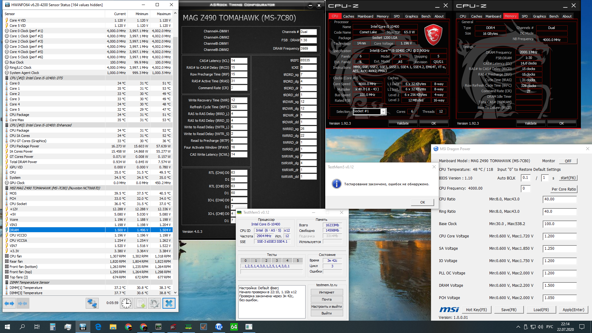 В общем, комрады и не только, дело пришло к такому. Говорю долго, возможно, но по факту, как было. Сам я сижу на Apex XI+8700K+4400 16-16-1T 1.540V. Плашки свои знаю. Собирал 2 комп для родителей (Z490 Tomahawk+10400+16GB 3000C15 Tactical RGB - те самые). Выжал на орешке на них 4000 15-21-2Т 1.47В, 4200 16-21-2Т 1.440В. Поехал к ним, собрал и увидел следующее (3690C14 1.360VDRAM):