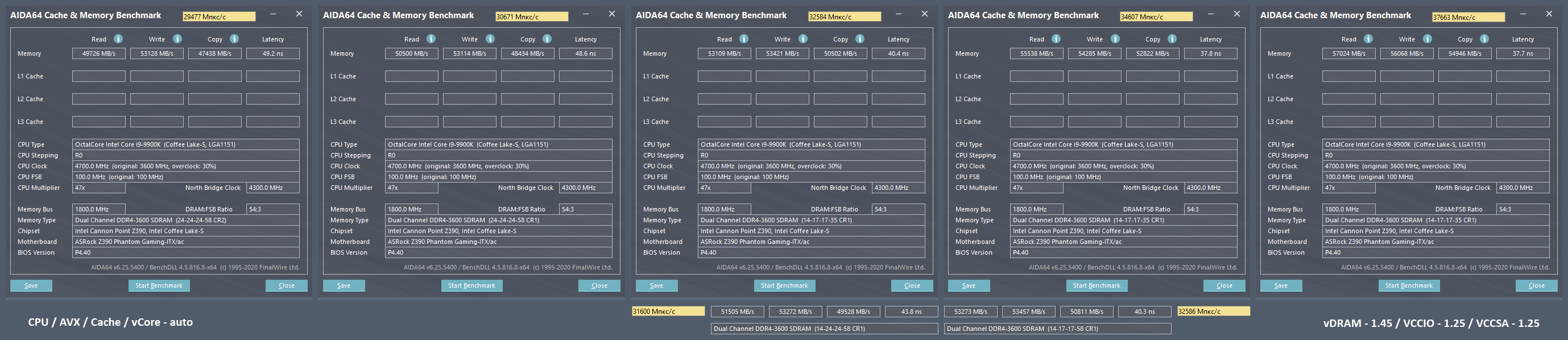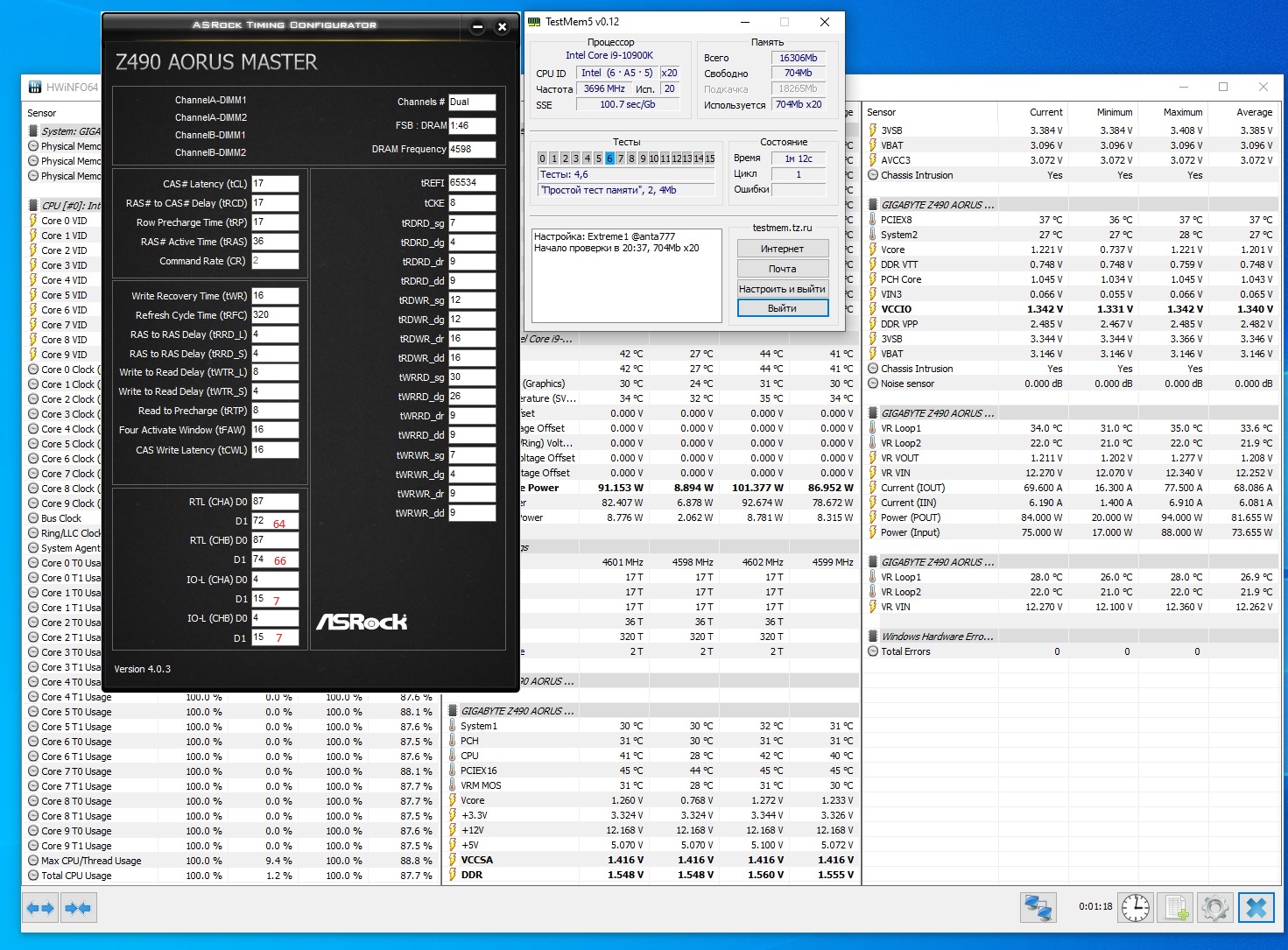 Доброго времени суток! Я не силен в разгоне ОЗУ и это первый опыт для меня да и помогали мне, подскажите пожалуйста, что у меня не так, почему такая высокая латенси? Напряжение еще не ужимал, на ОЗУ 1.45, SA 1.30, IO 1.25. Проц 10600k в разгоне до 4800 1.25v, мать MSI mpg z490 gaming edge, ОЗУ Ballistix 2x16 (xmp 3600 cl16-18-18-38 1.35) Экстрим стресс тесты полностью не проходил еще, но на 20 минутах пока без ошибок и температура модулей 56-57 градусов. Буду рад любой помощи и советам.