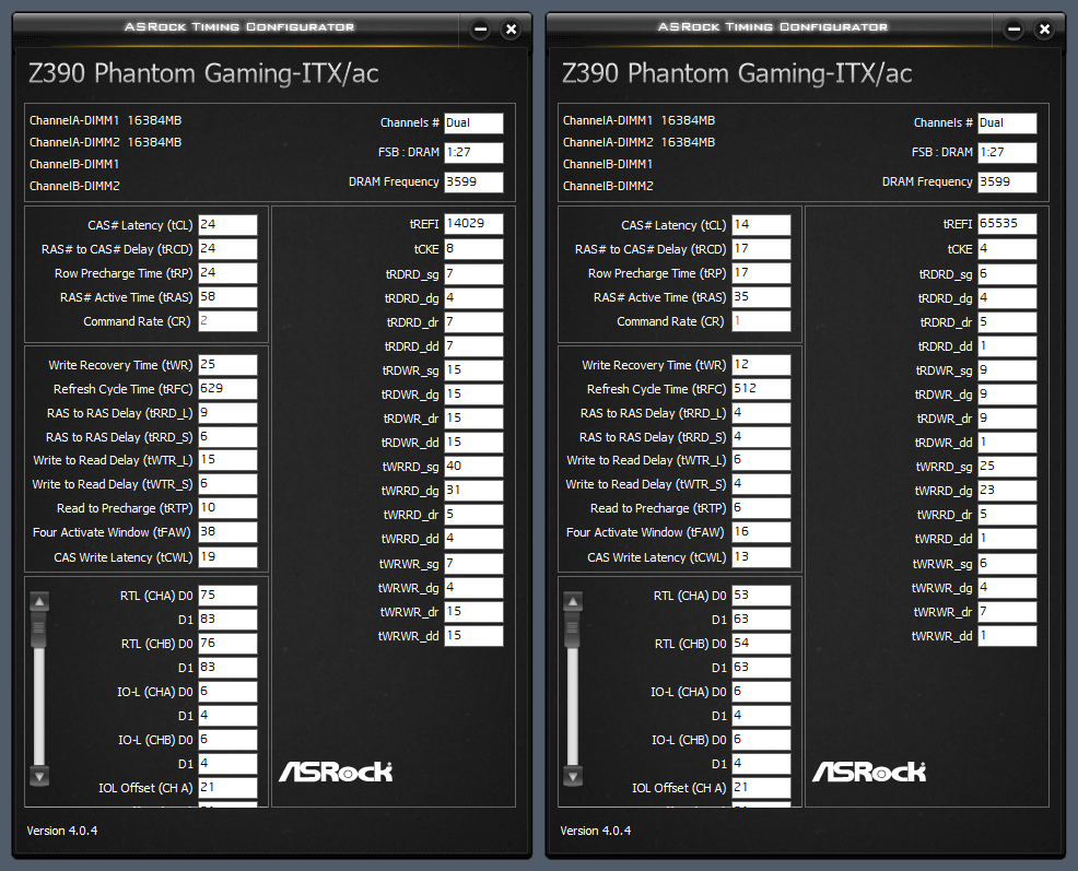 Вот таки дела получаются, что до 4133 включительно (на дуалах было 4133 14-15-2Т 1.55В), что наш CL равен действительному CL+1. Если вы ставите 4000 16-16, то получите 17-16. Это видно по самому RTL, по задержкам, по напряжениям (я эти 2 памяти вылизал и знаю, как и на какой частоте и какие тайминги!). С 4200 вроде как всё ок, на 4266 точно, ибо я ставил 4266 15-15 1.58V и получил ошибки. На 4400 16-16-2Т работало 1.530В как и надо (с 1Т 1.540В).