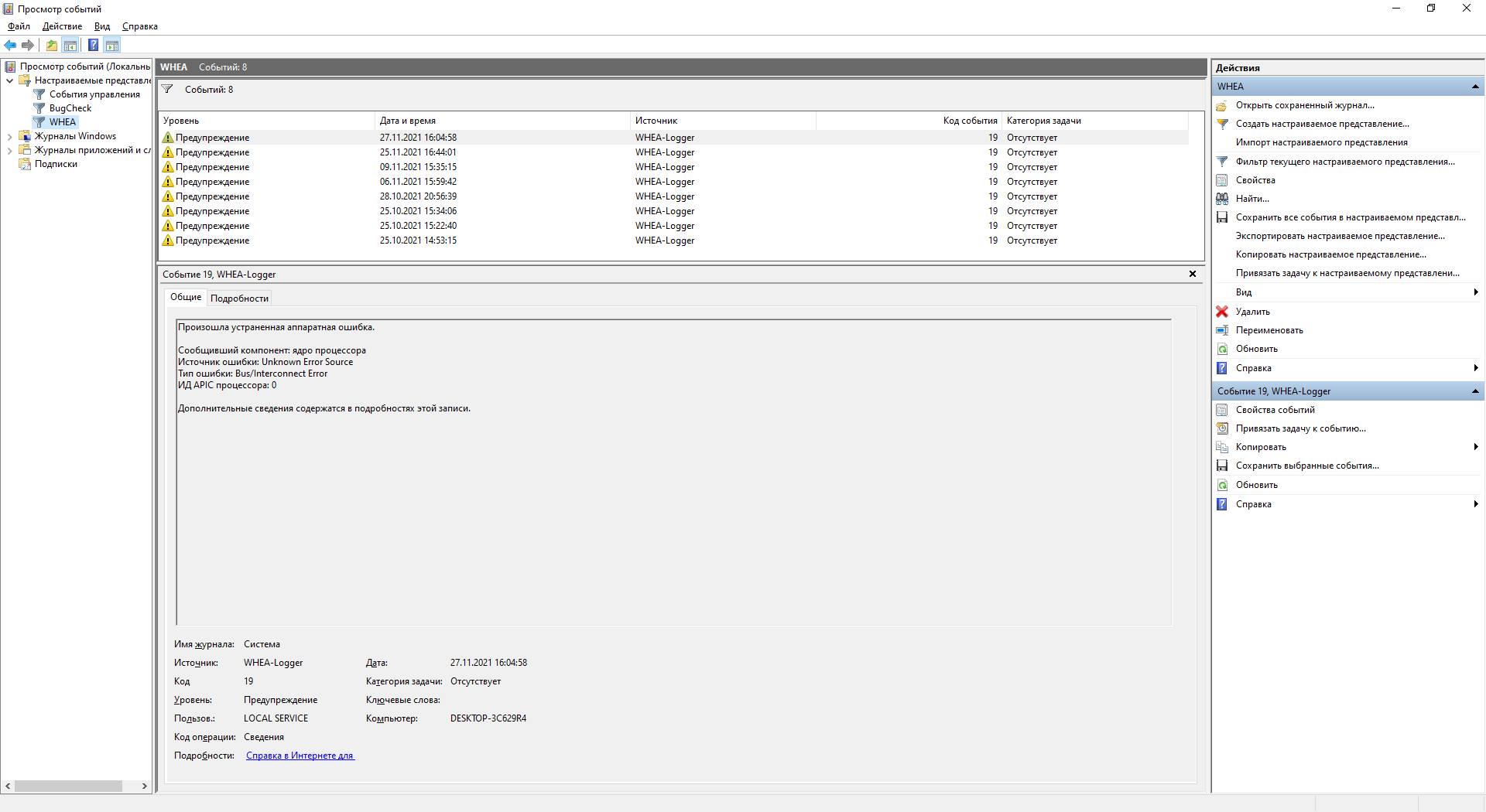 Добрый день. Прошу помощи с диагностикой следующей проблемы: Пару дней назад словил черный экран в браузере при просмотре видео и молотящие вертушки. Перезагрузив компьютер, решил сначала проверить логи и увидел несколько WHEA19: