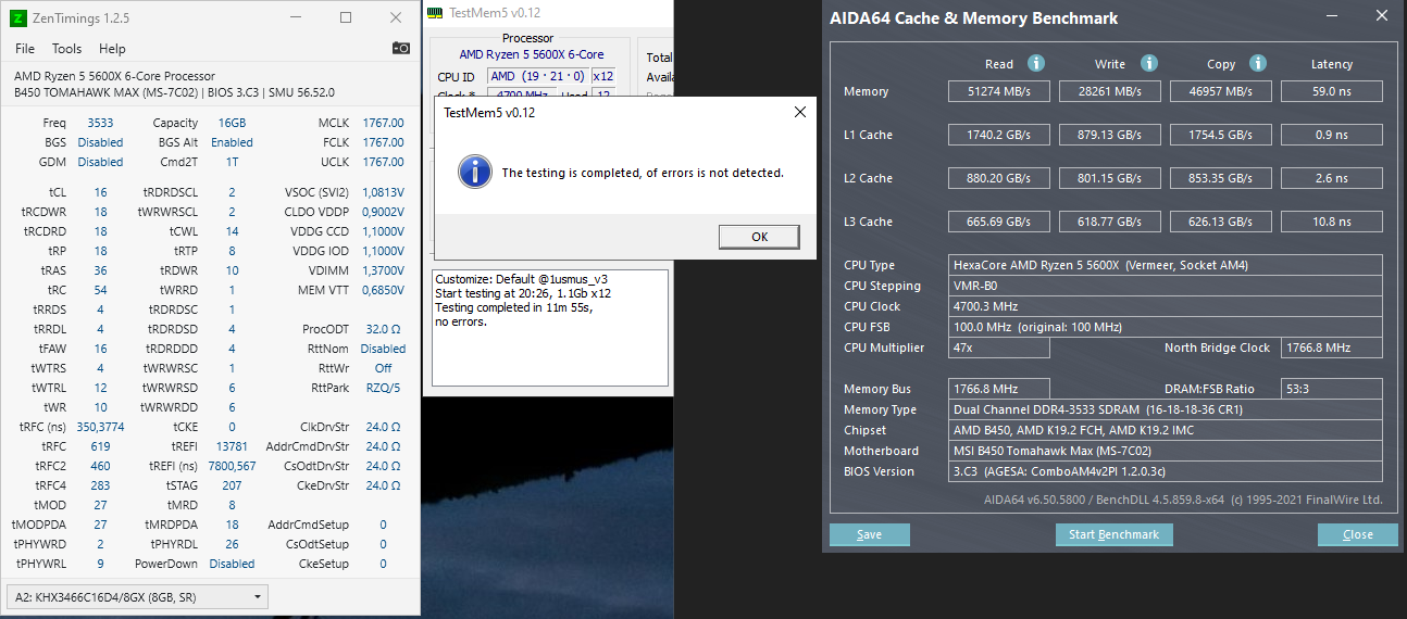 Алоха. Моя первая попытка в разгоне памяти. К сожалению попалась мне память с чипами Micron J die, по ней особо инфы не нашел по разгону. 3600 как и смена первычных таймингов не проходит мемтест от 1usmus, хотя система и игры работают без вылетов, но решил все таки остановиться на 3533. Мать томагавк Б450 макс. Что-то посоветуете? Есть ли смысл поднимать напряжение на таких чипах? Я не претендую на высокие результаты, просто хочу понять, что не сделал хуже чем в стоке))