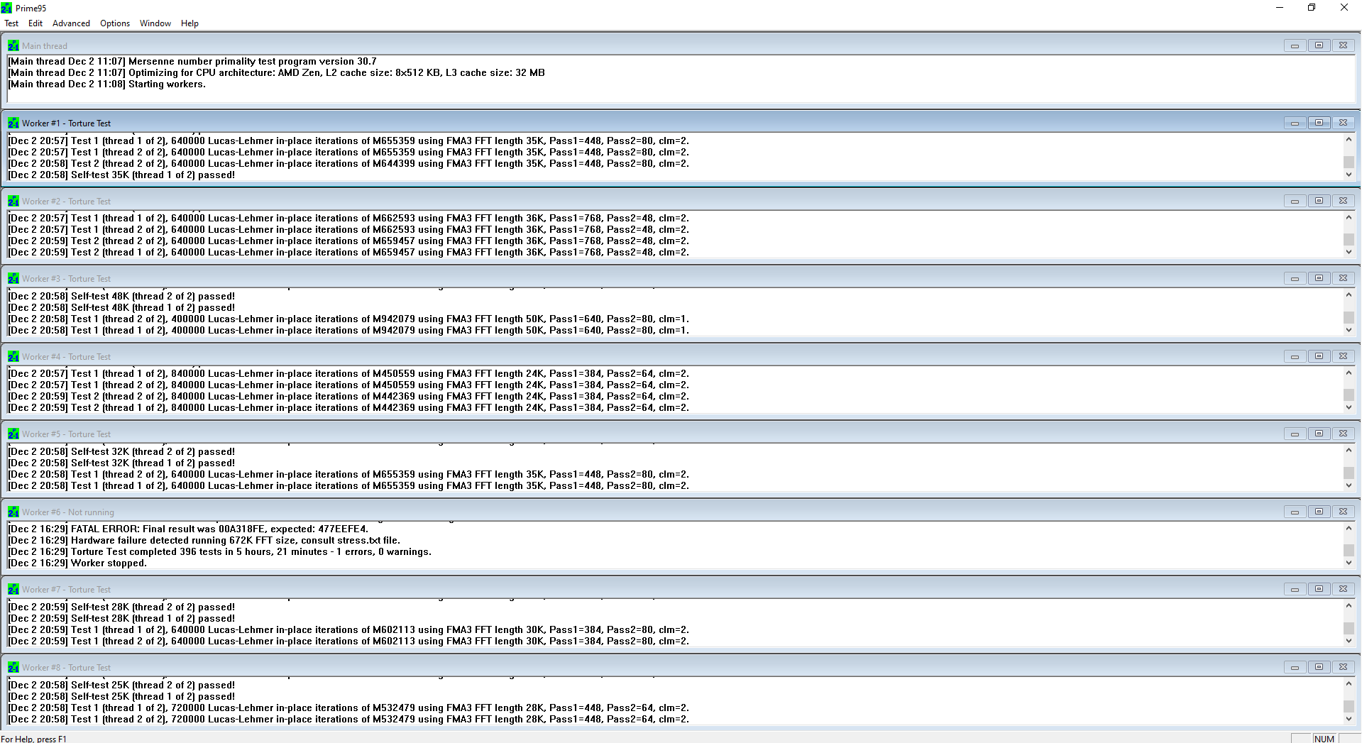 Но при проверке Prime95 согласно инструкции (за исключением фикса, ибо попутно проверял возможность ошибок в настройке CO) произошла ошибка спустя 5 часов и 21 минуту на размере 672K (лимит на скриншоты в сообщении). Остальные ядра тестировались 10 часов без ошибок, поэтому выключил Prime. Вопрос в следующем: с чем возможны WHEA19 (IF1900 ранее проблем не приносила, да и при "яме IF" ошибок, КМК, должно быть гораздо больше), черный экран и ошибка по ядру в P95? И насколько могут быть связаны эти проблемы? Заранее спасибо!