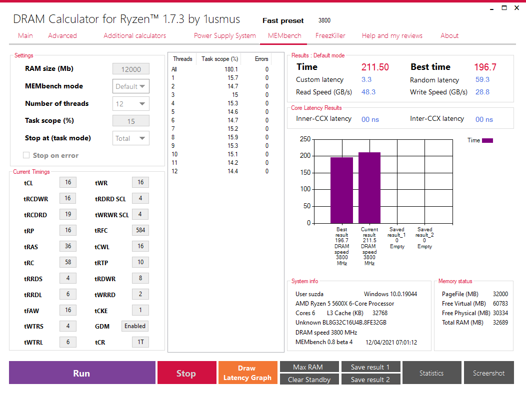 SRV1977 А чего напряжение так задрал? И tRTP = tWR/2 не? tRRDL 4 может. RCDRD можно скинуть до 20, тогда напряжение можно существенно снизить. В производительности потерь практически не будет. И Cad bus блок зачем 60-20-20-24, если у тебя GDM ON и синглы?