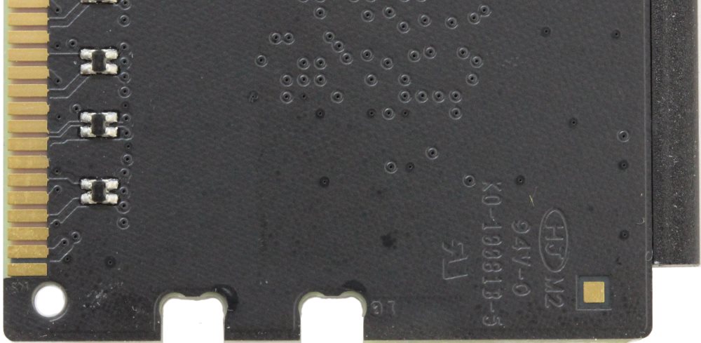 Признак качественных PCB - наличие контрольных точек на плате, которые представляют собой множественные сквозные отверстия в препрегах (слоях PCB) для проведения диагностики, например, для измерения уровней сигналов DQ, VDDQ и других. Такие PCB изготавливаются GULTECH Electonics (GTW) для Crucial, Kingston и других, SIMM TECH и UNIMICRON Technology для Samsung, Nan YA PCB Corporation для Kingston и других. Hsein Jinn не заморачивается этим и заливает паяльной маской всю поверхность PCB за исключением контактных площадок под микросхемы и пассивные компоненты.