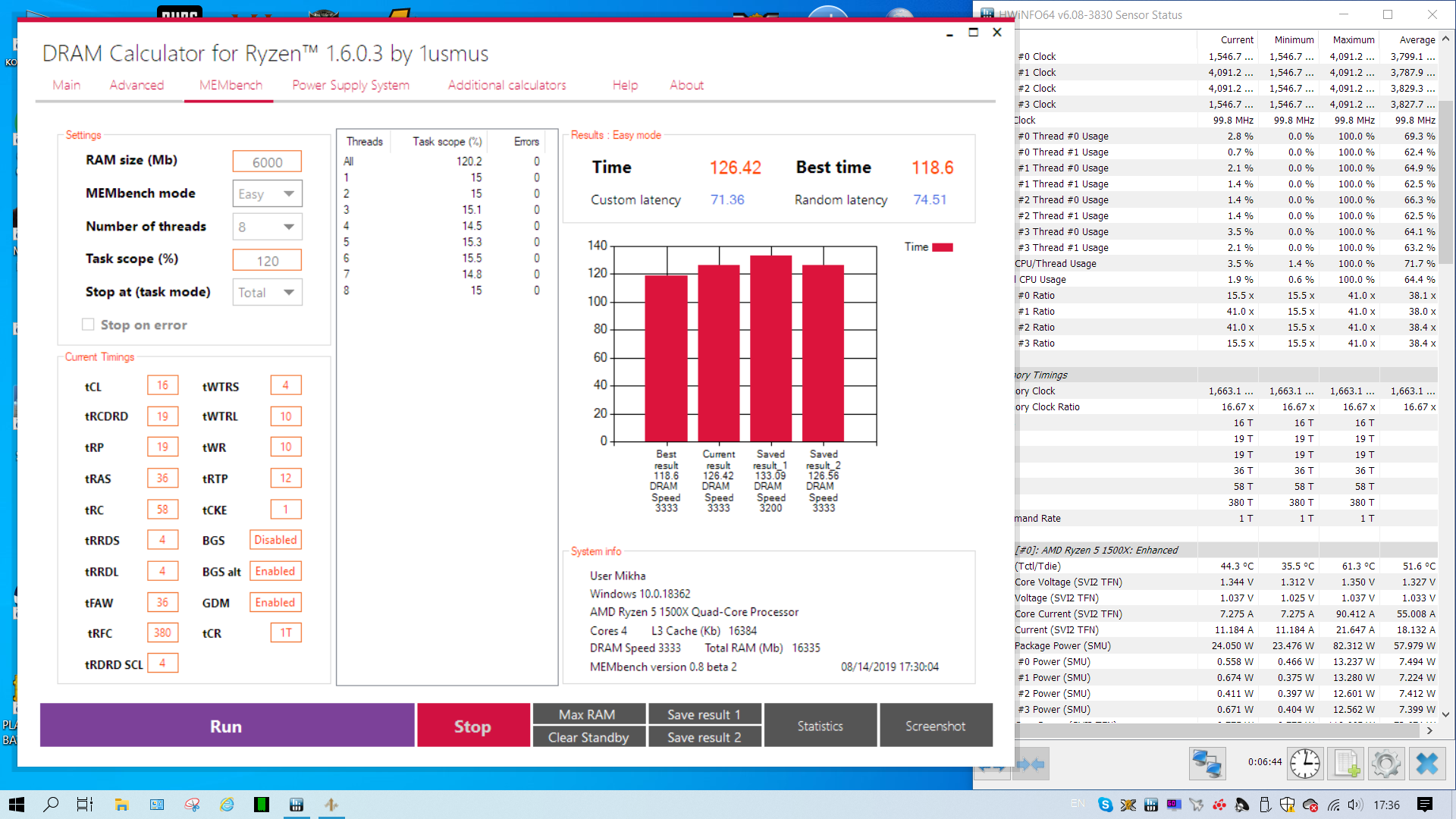 Тоже перешел на твой конфиг 3333, только некоторые вторички отличаются. 3400 16-20-20-20 на 1.45 по биосу и 1.47 по HWInfo долго мучал. Даже с самыми задранными вторичками выдает редкие ошибки, впрочем как и не с самыми задранными. Ощущение, что вольтажа еще хочет.