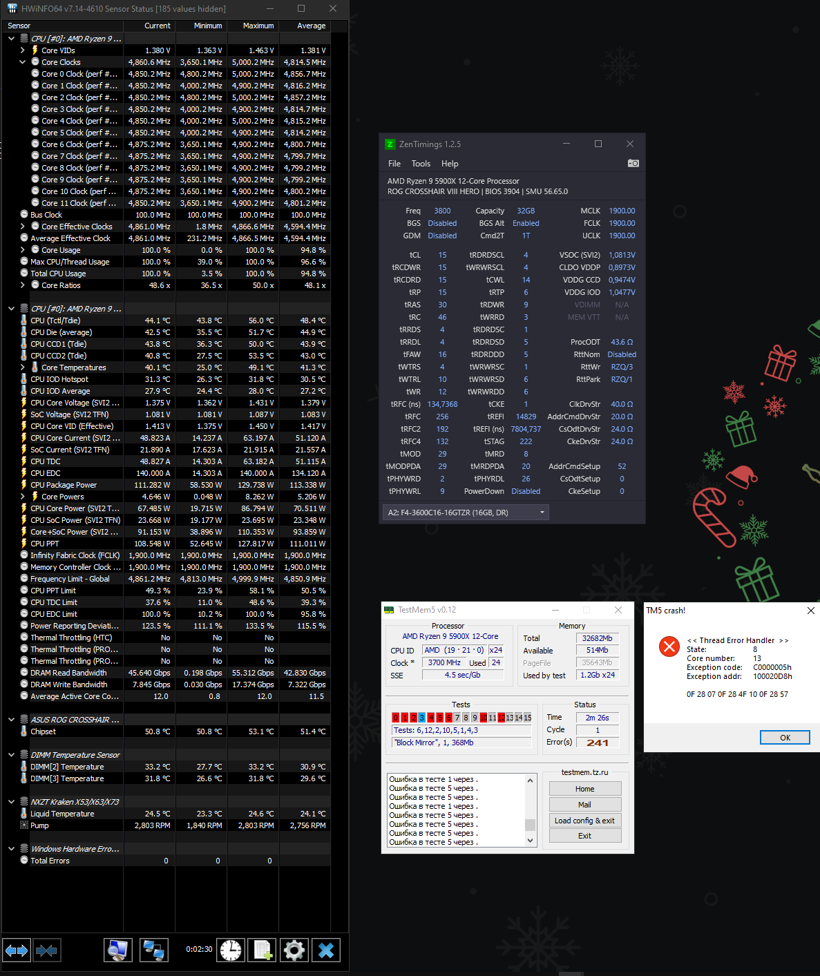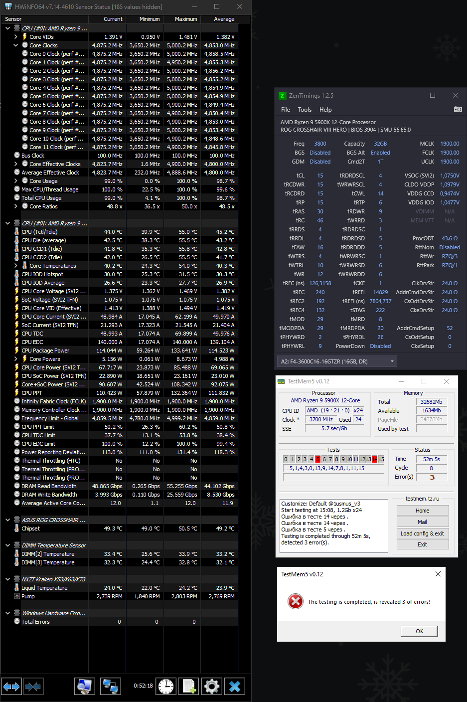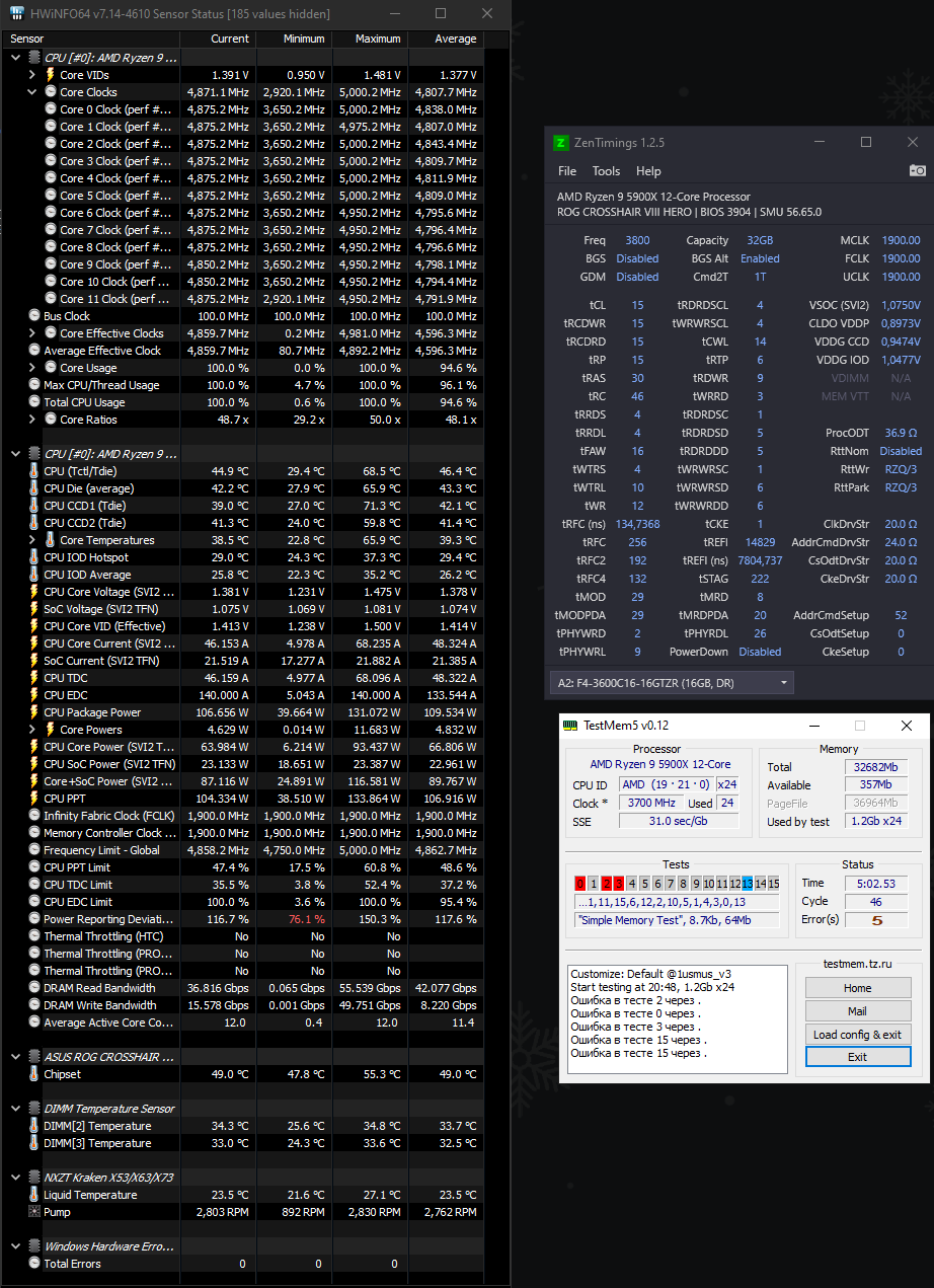 Приношу свои извинения. Писал с телефона так как еще тест проходила система. Прилагаю скрин. Вот с такими настройками в 1.5в система проходит карху тест 30к%. Ставлю 1.51 и выше вольта находит ошибки. Ничего при увеличении вольтажа в ZenTimings не меняется. ДДР охлаждается отдельным кульком, температура 35С. RP RAS RC пока не редактировались. Хотелось больше сжать тайминги при повыщении вольтажа, но пока вот такая проблема.
