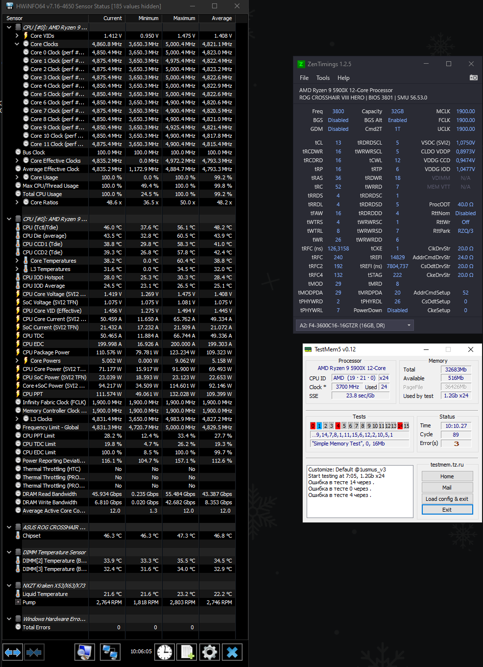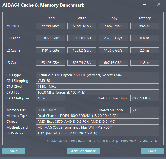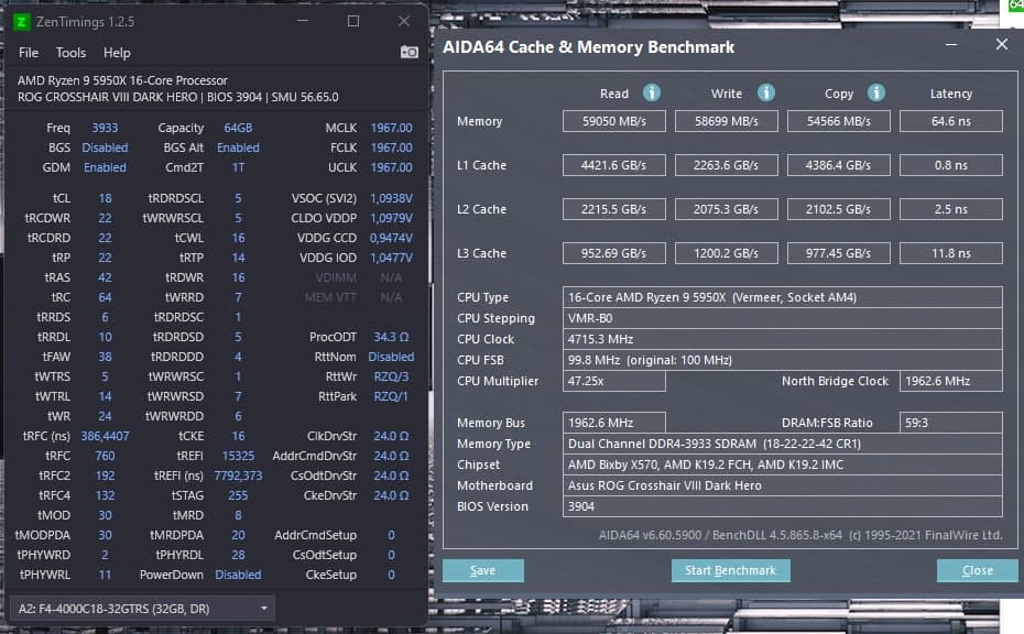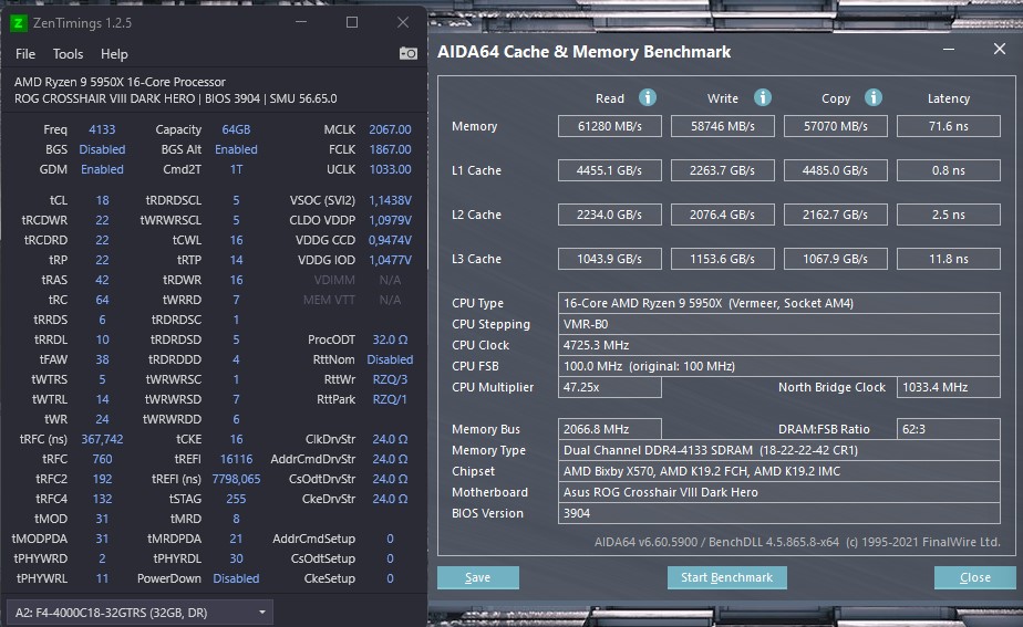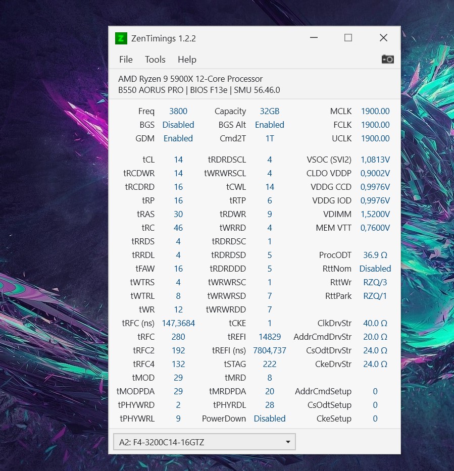 MSI Tomahawk x570s + Ryzen 7 5800x + Crucial Ballistix Red RGB 32GB 3600MHz CL16 (BL2K16G36C16U4RL) 2+4 DRAM Voltage 1.38. Из вторичных tRFC оставил в АВТО, поскольку при попытке его изменения с 700 на 576 или 608 (как калькулятор посчитал) всё тупо зависало и не грузилось совсем. Слегка разогнал на 4000 с g1 (2000), начинал с 18-22-22-42, дошел до 16-19-16-36 (далее - вариант 1), также подкрутил вторичные слегка (см. скрин под спойлером) и залип сравнивая с предыдущими 18-20-20-40 (далее - вариант 2) - в 1 по сравнению с 2 скорости памяти прямо хороши стали, а вот L3 кэш в варианте 1 внезапно неприятно просел. Куда теперь тыкать и что дальше пробовать? Все данные под спойлером.