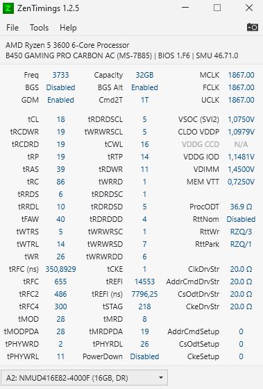 Помогите с настройкой вторичных таймингов Купил с США за 105$ (+9$ доставка) Neo Forza FAYE 32GB (2x16GB) 288-Pin DDR4 4000 (PC4 32000) SDRAM Desktop Memory Model NMUD416E82-4000FG20 Память dual rank, CPU Ryzen 3600, MSI B450 carbon. В соседней теме сказали, что чипы самые худшие, Hynix CJR, не спорю, но за эту цену того стоило Сейчас запустил на 3733Mhz 18-19-19-19-39, memtest dos проходит