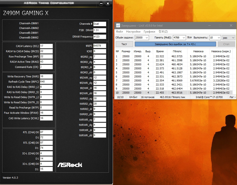 garison87 кхм, прогони LinX 25K (именно 25К) хотя бы 10 повторов, если будут невязки - IO/SA, если ошибка - VDRAM (и возможно VCORE)... интересно, верна ли моя теория проверки ;) Изменение RFC (что увеличение, что уменьшение) ведет к правкам в напряжениях... 616 для 4133 должно хватать, 656 - это "космос". WTRL = RTP и WTRS = 4 (=WTRL/2)... это мое имхо, а то тут мнения расходятся. IOL-ы = 6, странно что 7-ки, видимо Гена шалит. На крайняк, попробуй REFI снизить.