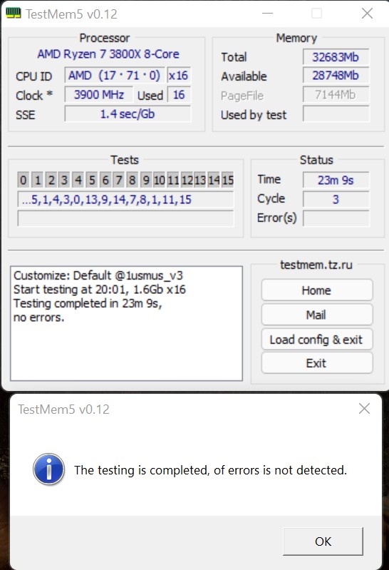 7. При желании протестировать память избыточным тестом в TM5 с конфигом 1usmus_v3 меняем количество 3-х циклов в "mt.cfg", "cycles=3" скажем на 8 или более