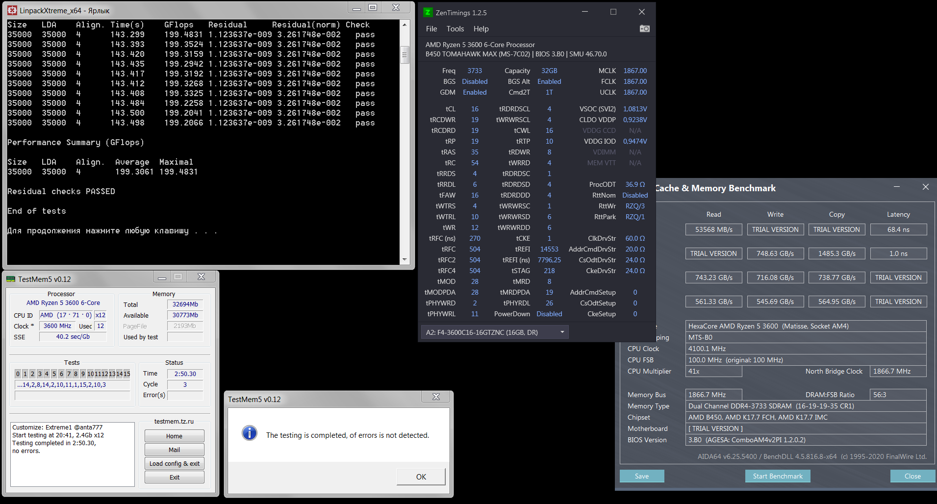 Что-то как-то тяжко с этими планками идёт. Казалось бы, настроил профиль, tm5 проходит, линпак 10гб проходит.