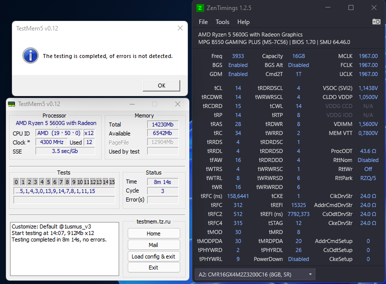 Забегая вперед хотел позже написать, но решил сначало по порядку ответить, на cl 14 сделал в конце после всего секса другими вариантами, хотя надо было сначало с этого начать, но результат по сути такой же, при выставлении cl14 3733/1866 vsoc=1.106 vddp 0.950 vddg авто procodt 34.3 с вкл. GDM vdimm 1.47 остальное авто, завелось, но такой же результат ,когда были и со вторичками настроенными, при этом при 1.45 уже не хватает и при 1.47 горячая . tRFC попробовал, так да разницы нет, 256 нс потребовал напругу 1.41 (со всеми настроеными таймингами), а стандарные 288-304нс на прочих настроенных таймингах хватило 1.39 В целом получилось ,что чтоб латентность опустить путем первого тайминга с 16 до 14 , да и остальных 14-14-14-14-30-44 дает уменьшение на 4.6нс ,но напруга не менее 1.47 (это для установки в 14 tcl и trcdrd), ниже привел результаты , делал без безопасного режима, т.к. за*баться можно окончательно, если еще и в безопасный режим вкл. ,поэтому результаты гуляли +- 0.5-1 нс Результаты с 161515153246 , 161415143246 по сути одинаковые , там вторички мог еще некоторые ужать, но результат тот же. 14-14-14-14-30-44 да лучше как и говорил на 4.6нс ,но напругу задирать нужно и то при 5-6 цикле теста могла выйти ошибка (далее скажу) , когда перебирал первичные тайминги, повторюсь проблема была с tcl и trcdrd (первыми таймингами), остальные норм масштабировались.