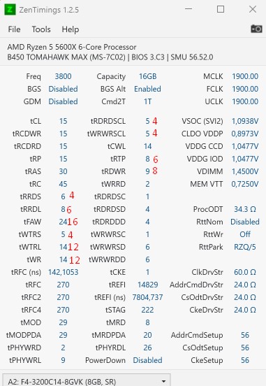 2 планки Micron 3600(E-die), 2 планки Goodram 3600(C-die) Первичные тайминги такие получились 16 19 20 21 30 Напряжение чтобы поставить первый тайминг 16 пришлось поднять на 1.45 Если уменьшить любой из этих таймингов то будут ошибки в тестмем. Тайминги все разные, но меньше не везет. Дальше буду вторичные считать по формулам, но первичные ж норм? Что можно менять или оставить?