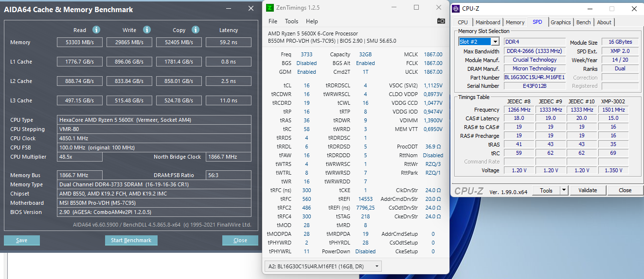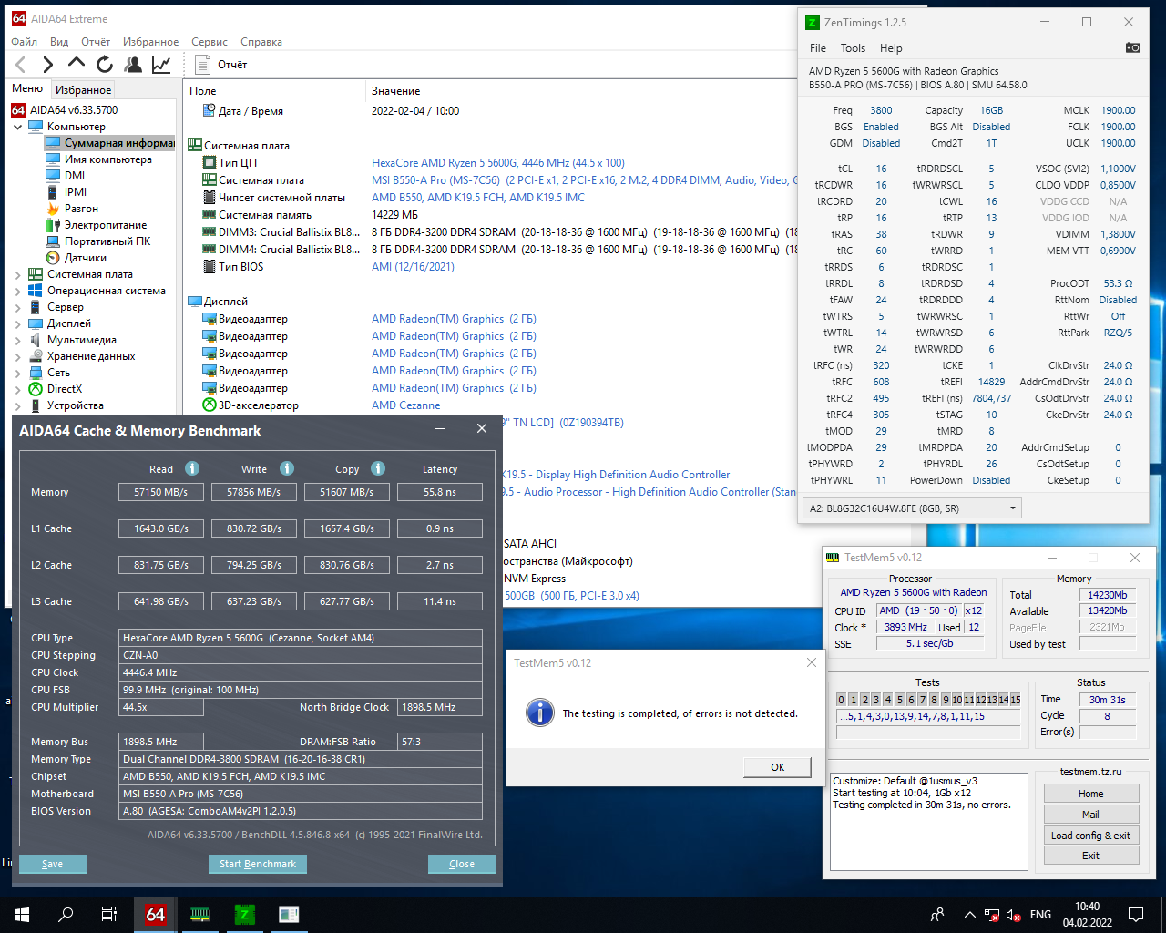 Проц 5600G, мамка MSI B550-A Pro, планки 2х8Гб Баллистики U4, напряжение 1.38В (по датчику 1.388), но и на 1.35 (по датчику 1.356) работает вроде стабильно. Латентность видел самую меньшую 55.7 нс.