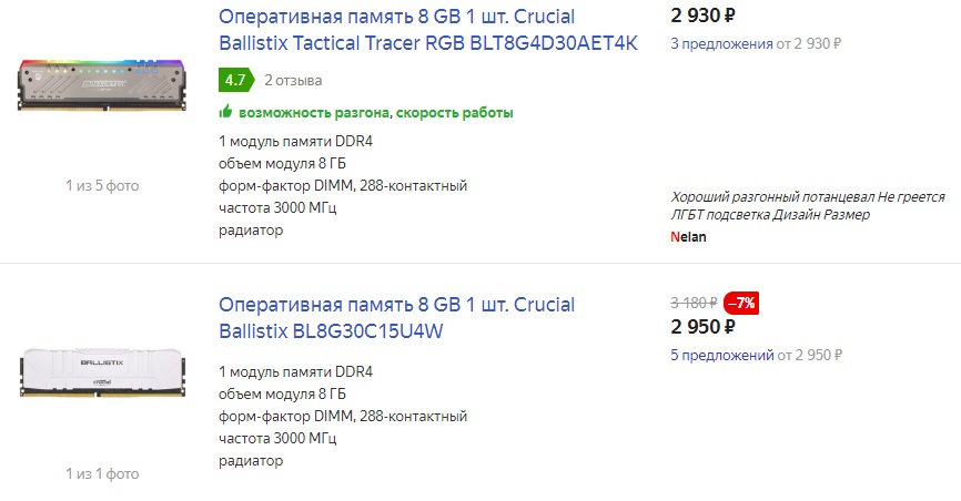 Новую: Позиция 1-3 на чипах Micron E-die (бюджет 6000-7500 р., смотрите так же предложения на Алиэкспресс): 1. Crucial Ballistix BL2K8G30C15U4 (берем любую с такой маркировкой), ссылки: белая, красная, черная, белая+RGB, красная+RGB, черная+RGB 2. Crucial Ballistix BL2K8G32C16U4 (берем любую с такой маркировкой), ссылки: белая, красная, черная, белая+RGB, красная+RGB, черная+RGB 3. Crucial Ballistix BL2K8G36C16U4 (берем любую с такой маркировкой), ссылки: белая, красная, черная, белая+RGB, красная+RGB, черная+RGB Позицию 1 и 2 можно купить по 1 планке отдельно, маркировка BL8G30C15U4 и BL8G32C16U4, часто выходит даже дешевле, чем покупать комплектом. При покупке 2 модулей отдельно отличий в работе и разгоне не будет, главное купить модули с одинаковой маркировкой: 3000 CL15 белая, красная, черная, белая+RGB, красная+RGB, черная+RGB 3200 CL16 белая, красная, черная, белая+RGB, красная+RGB, черная+RGB 3600 CL16 белая, красная, черная, белая+RGB, красная+RGB, черная+RGB Позиция 4-6 на чипах Samsung B-die(бюджет 9000-11000 р.): 4. Patriot Memory VIPER STEEL 4000 Mhz PVS416G400C9K 5. Patriot Memory VIPER STEEL 4400 Mhz PVS416G440C9K 6. Patriot Memory VIPER RGB 4000 Mhz PVR416G400C9K Вторичный рынок (Авито): Ищем память из раздела "Новое" или из следующего списка: 1. G.SKILL Trident Z F4-3200C14D-16GT с любыми буквами в маркировке после "GT", XMP профиль 3200 14-14-14-34; 2. G.SKILL Trident Z F4-3600C16D-16GT с любыми буквами в маркировке после "GT", XMP профиль 3600 16-16-16-36, но в конце маркировки не должно быть буквы "C"; 3. G.SKILL Ripjaws V F F4-3600C16D-16GVK 4. G.SKILL Flare X F4-3200C14D-16GFX 5. G.SKILL Ripjaws V F4-3200C14D-16GVK 6. Team T-Force XTREEM с маркировкой TXKD416G3733HC18ADC01, TXKD416G3866HC18EDC01, TXKD416G4000HC18EDC01, TXKD416G4133HC18FDC01, TXKD416G4300HC18EDC01 и TXKD416G4500HC18EDC01 (частота 3733, 3866, 4000, 4133, 4300 или 4500 Mhz); 7. Crucial Ballistix 2x8 Gb - BLS2K8G4D30AES и BLS2K8G4D32AES, 2x16 Gb - BLS2K16G4D30AES и BLS2K16G4D32AES с любыми буквами в маркировке после "AES".