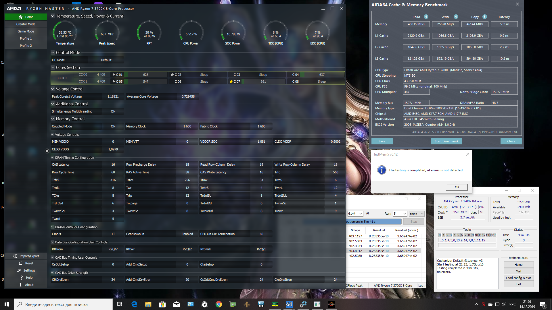 Ниче не понимаю в разгоне памяти(( есть память 3200сл14, хотелось очень 3600сл16 чтоб не париться и просто воткнуть, но ее не было. В общем, думаю ну ладно, подредактирую хоть тайминги что ли, скачал этот калькулятор, скачал тайфун. Сначала профилем v1 попробовал фаст тайминги - система не занрузилась, потом снял тайфуном тайминги своей памяти и ввел новые значения фаста - не запустилась. Я единственное не понял с параметром trfc, в калькулятор одно значение, а в биосе их 3 кажись, и все разные, я ввел одно из калькулятора и все они стали этим значением, мб в этом проблема. В итоге нашел в биосе предустановленные начтройки разгона и поставил 3600сл16, работает на 1.35в как и дефолт 3400сл14, тестмем0.5 проходит. Все ли норм? Чем еще прогнать память? Есть ли смысл в ночном запуске мемтеста досовского?