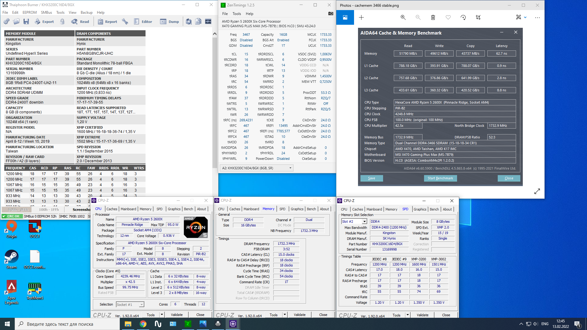 Добрый день. Сменил оперативную память на Crucial Ballistix [BL2K16G32C16U4B] 32 ГБ. Разогнал до 3800, тайминги настраивал по формулам. Посмотрите пожалуйста, есть ли ошибки.