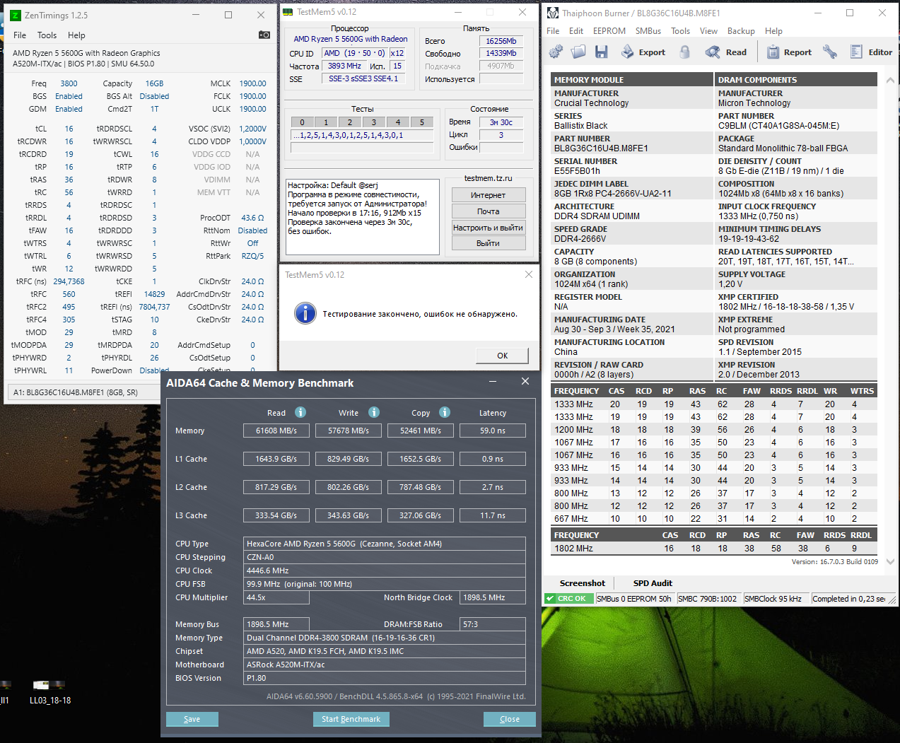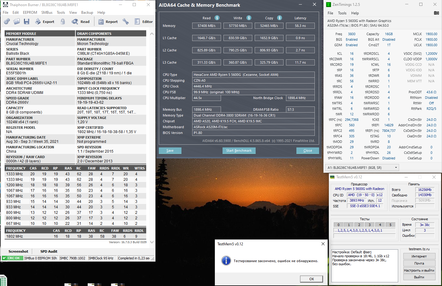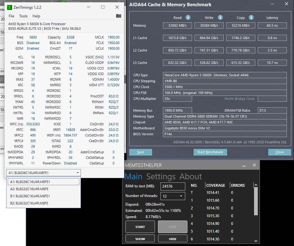 Добрый день. В мой комплект Баллистиксов 2x8Gb 3200CL16, которые c помощью форума гнались до 4000CL16, были добавлены Баллистикс 3600CL16 2x8Gb (были в наличии и не дороже 3200ых). Пока что в процессе разгона, дошел пока только до tRRDS/L, всё, что ниже - в авто, результат прикрепляю.