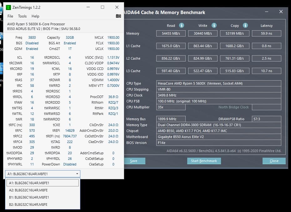 Конфигурация такая: Планки памяти: Crucial Ballistix две планки по 16 гигов, в двухканальном режиме. Первая, BL16G30C15U4W.M16FE1 и Вторая, BL16G30C15U4W.16FE Материнская плата: B450 Pro S (Bios version: 3211, AGESA V2 PI 1.2.0.3 Patch C) Процессор: Ryzen 7 2700