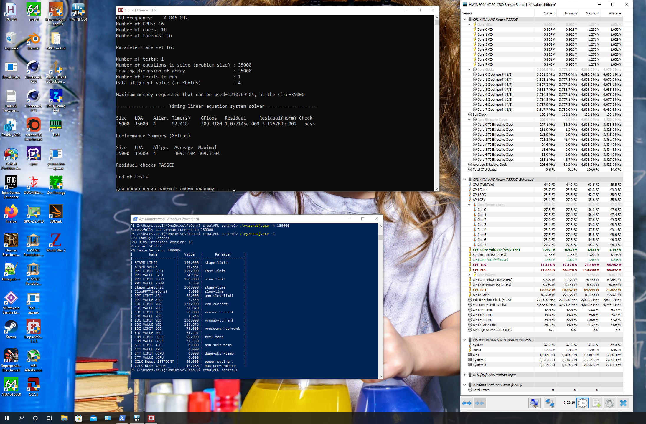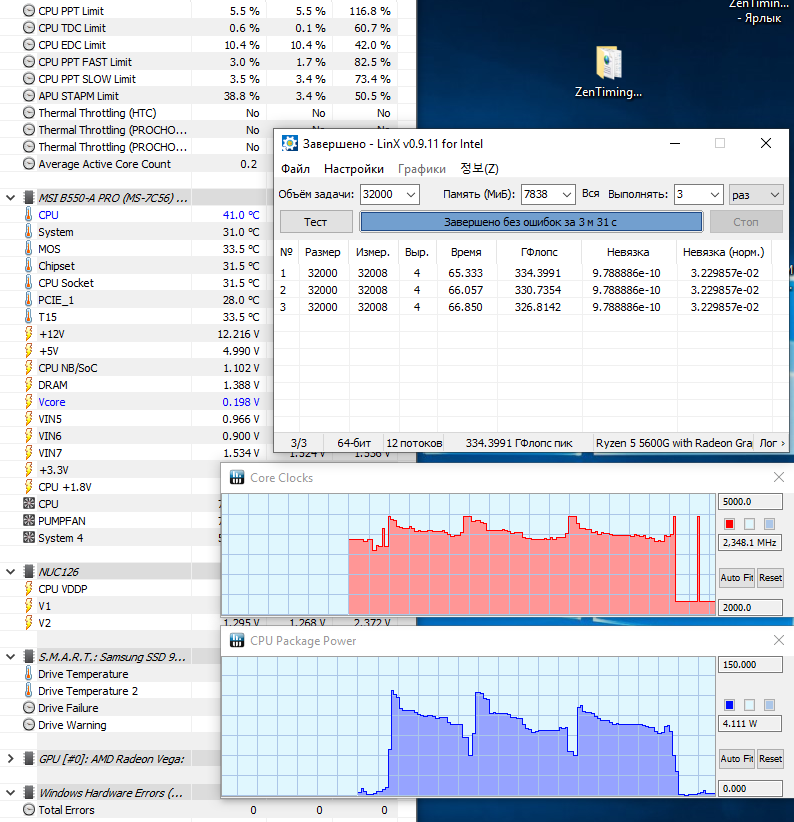 Добавлено спустя 5 часов 36 минут 16 секунд: Проверил этот же бенч на 5600X с EDC 125 и 350. Рез-т тот же, 275 гфлопс. Интересно ... Скорее всего в Cezanne какой-то из power лимитов срабатывает. Если на Vermeer за 130W переваливает, то можно предположить, что в 5700G без ограничения уйдет за 160. Но там по дефолту 150W. Завтра еще раз повнимательнее присмотрюсь к лимитам power. Во всех текущих версиях AGESA для Cezanne, в моем случае, изменение всех этих STAPM, slow, fast и т.п. ничего не меняло.