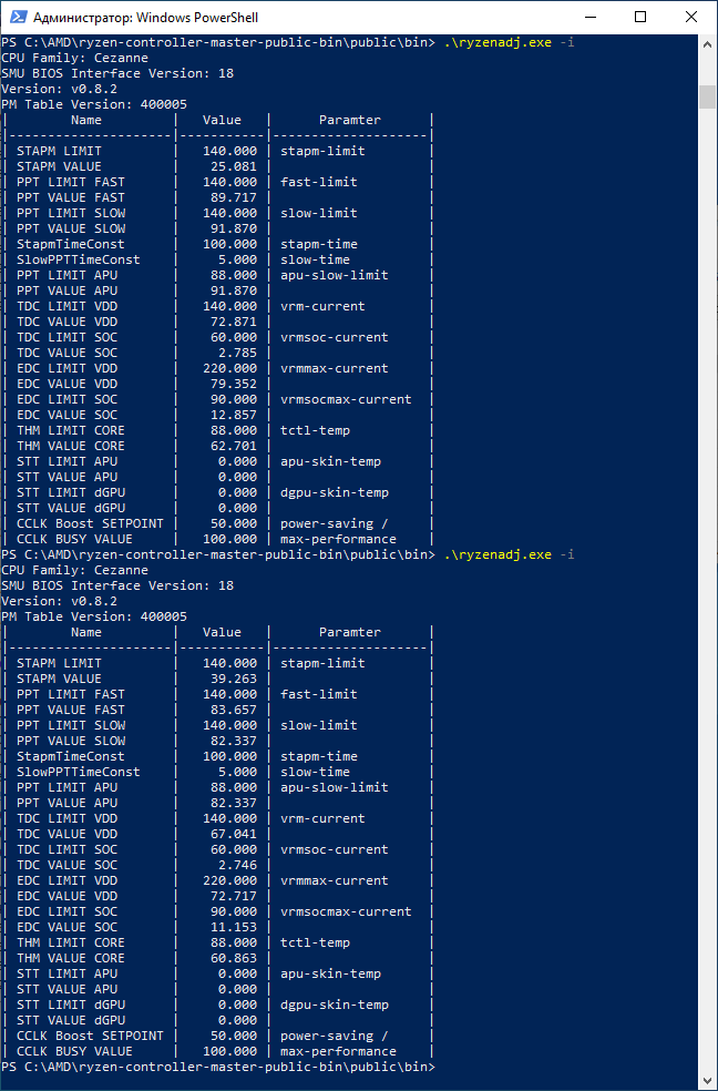 Еще раз сравнил 5700G и 5600Х - похоже что в APU с управлением питанием не все ровно, потому и дроп частоты от низкого EDC. По факту, на 5600Х схожий дроп при упоре в PPT, которым(и) пока не ясно, как управлять в Cezanne, EDC для 5600Х практически погоды не делает. На 5700G лимиты PPT 150W, причем с низким EDC, быстрее растет PPT Fast. Возможно он и триггерит дроп, и предел тротлинга по EDC у APU много выше, т.к. нужно для буста GPU. C этими Power лимитами в APU какой-то треш. Как вам, к примеру, такой их перечень из pm_table: STAPM limit, PPT FAST limit, PPT SLOW limit, PPT APU limit, STT APU limit PPT в HWInfo репортится как STAPM, и вместе со SLOW и FAST = 150W, PPT APU = 88W. Из всего перечня меняется только STAPM, правда бестолку...