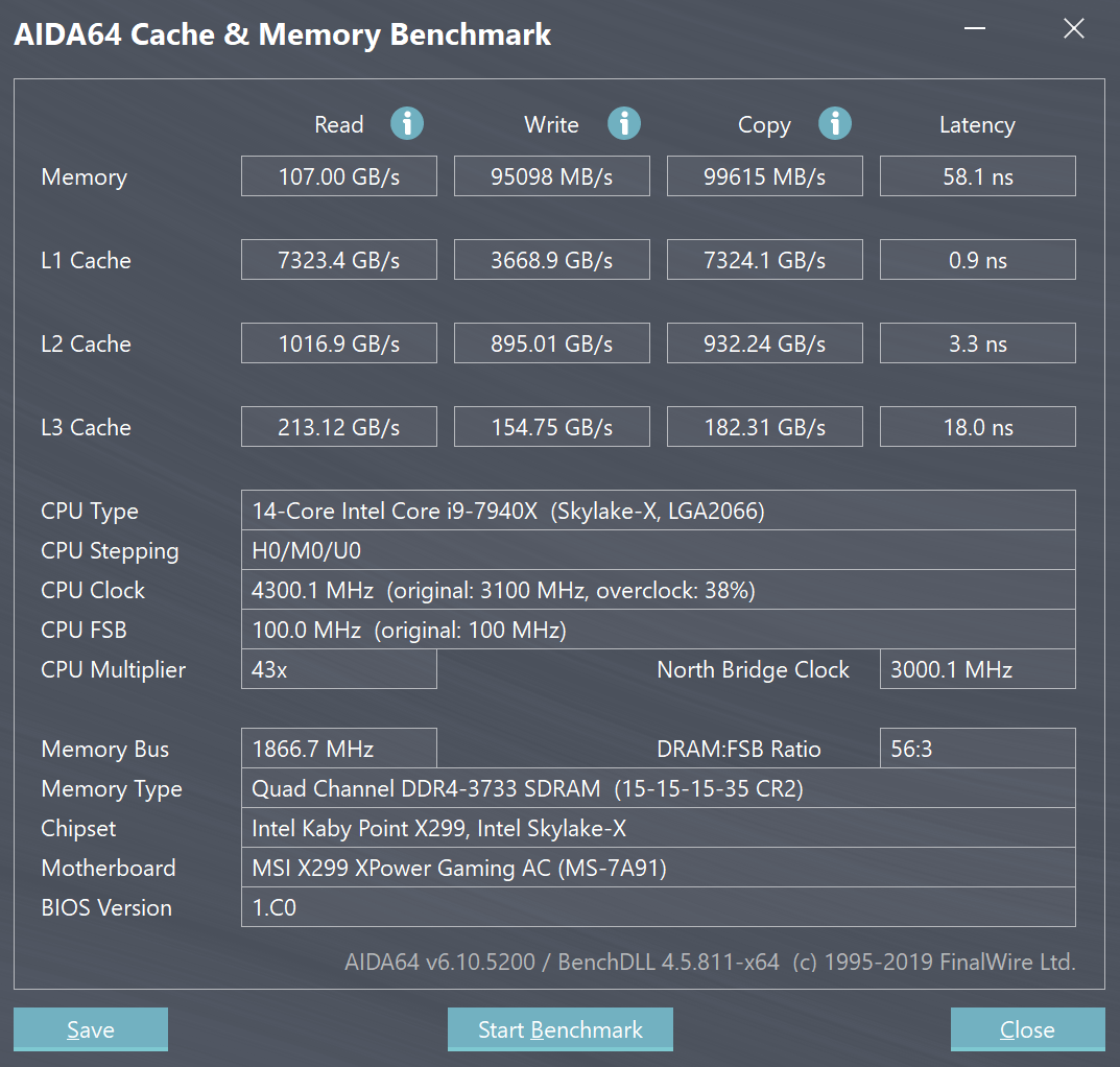 CPU Name: Intel Core i9-7940X @ 4300MHz Motherboard Model: MSI X299 XPOWER GAMING AC