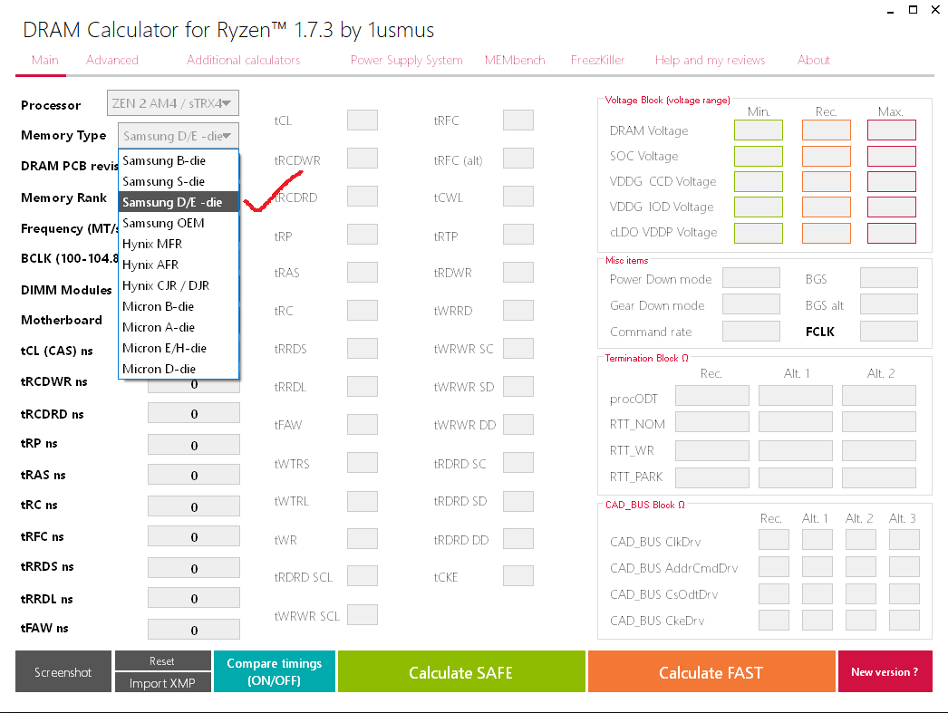 Если я не ошибаюсь, то в калькуляторе нет пресетов для самсунг e-die. Тайминги от micron e-die точно не подойдут. Надо ориентироваться на bad bin b-die и вручную подбирать.