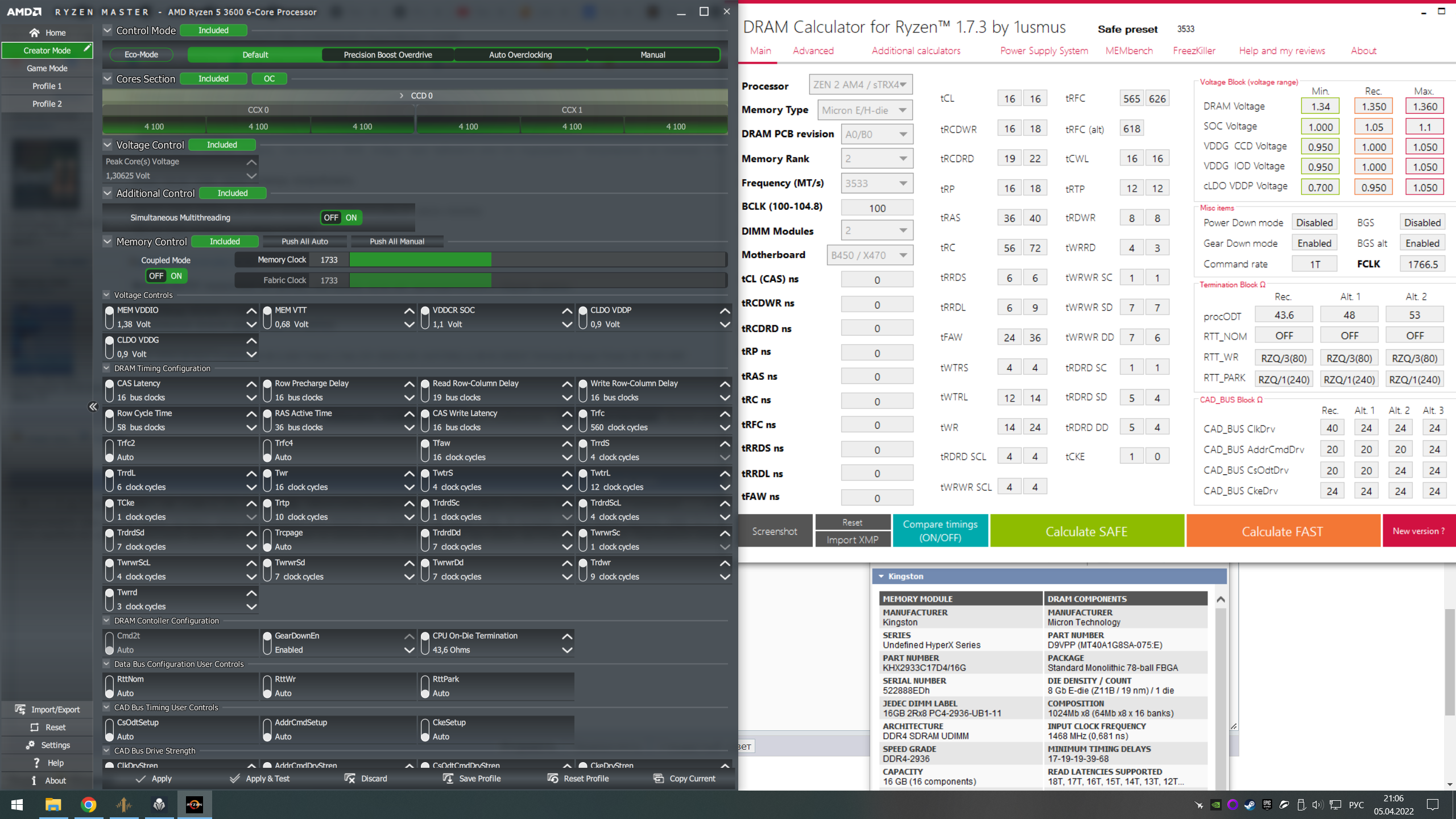 и всё было хорошо(не считая задранного vsoc, остальное авто). При переезде плашки я перемешал и толи нужно подбирать порядок, толи хз что, но на таичи эти настройки не едут нивкакую, сначала бадался с WHEA, при VDDG IOD >1.05 и Vsoc 1.16 они пропадают...но странные фризы в играх. ТМ5 проходит и абсолют и экстрим, но при этом в прайме large fft ошибки. Снижал частоту/шину ошибки пропали при 3600. Перебирать плашки впадлу, спустился в 3600, пойдут таки тайминги или что подправить? Напряжение на планках 1.46