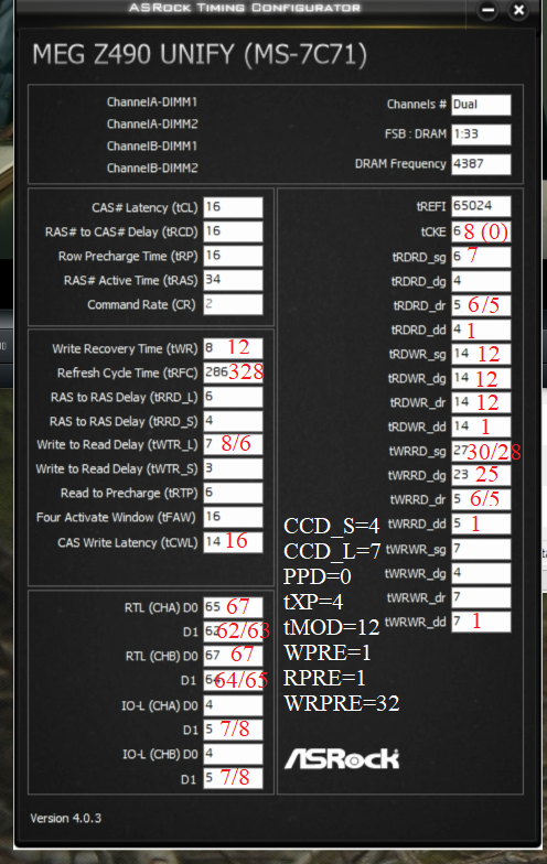 Как найдёте минимальное напряжение, снижайте tRFC. Это будет 272 или 280 или 288 или 296 или 304 или 312 или 320. Надеюсь, коллеги меня поддержат. P.S. RTL: Round Trip Latency=Enabled. Turn Arround Timing Control=Disabled. RTL Dynamic mode. IO Comp A=21 IO Comp B=21 RTL Init A=67 RTL Init B=67 RTL A=62 (быстрее/правильнее) или 63 RTL B=64 (быстрее/правильнее) или 65 IOL Init A=4 IOL Init B=4 IOL Init A=7 (быстрее/правильнее) или 8 (не очень рекомендую, но имеет место быть) IOL Init B=7 (быстрее/правильнее) или 8 (не очень рекомендую, но имеет место быть)